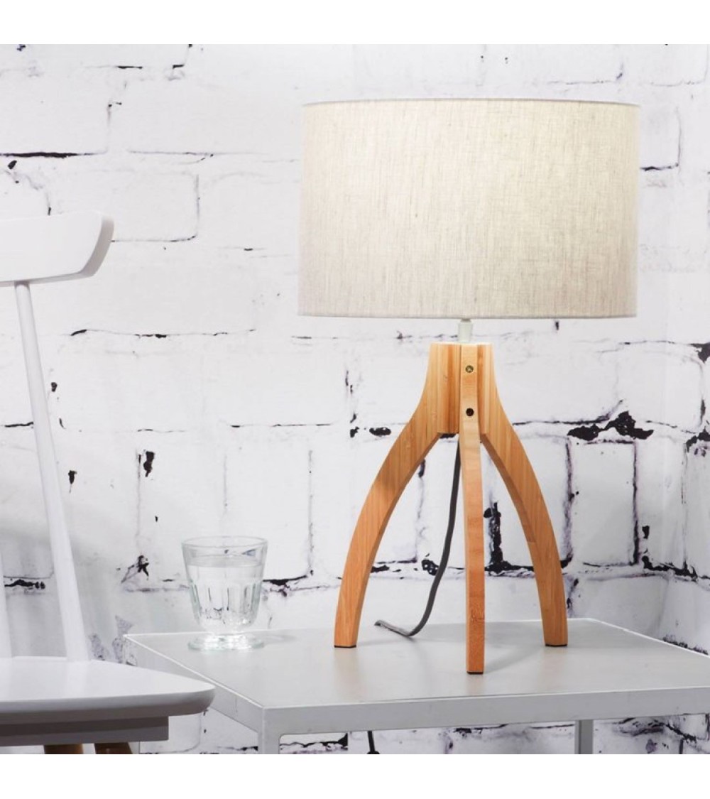 Lampe à poser de la collection Annapurna éditée par Good & Mojo composée d'un pied tripode en bambou naturel et d'un abat.jour de forme cylindrique habillé de lin ; ce modèle est équipé d'un cordon d'alimentation avec prise de secteur et interrupteur.Les luminaires Good & Mojo sont issus du commerce équitable. Pour tout achat d'un luminaire, la marque propose l'opération - une lampe achetée, un arbre planté et 5 pour cent du prix du luminaire est reversé à l'association Waka Waka qui fournit des lampes solaires aux populations n'ayant pas accès à l'électricité.La collection Annapurna se décline en deux modèles (lampadaire et lampe à poser) proposés en différents coloris.Ampoule - 1x40W E27 (non fournie).