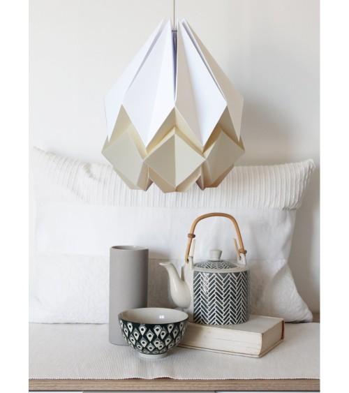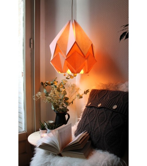 La suspension HANAHI est inspirée des techniques de l'origami et apporte de la légèreté à votre espace. Cet abat.jour aux lignes géométriques douces se combine parfaitement avec différents styles et atmosphères.Cette belle suspension pliée à la main trouvera facilement sa place dans un salon ou dans nimporte quelle pièce avec une belle hauteur sous plafond. Cela vous aidera à créer une atmosphère chaleureuse et confortable. Nos suspensions HANAHI sont faites en PAPIER de haute qualité, sans acides, produit en France avec des fibres végétales issues de lexploitation responsables des forêts (labelle FSC®).Le papier, matériau recyclage par excellence, correspond entièrement à notre démarche de développement durable ! Et cest exactement pour cette raison que notre papier nest pas traité anti.feu ou imperméabilisé. Ces traitements empêchent le recyclage à 100 pour cent du papier et sont très nocifs. Lutilisation de ce genre de produits chimiques est contraire à notre philosophie et engagement pour lenvironnement. Nos suspensions en papier sont à utiliser à lintérieur et de préférence dans des pièces peu humides. Et surtout uniquement avec des ampoules LED. Le câble électrique n'est pas fourni avec la suspension. Les suspensions Hanahi sont à utiliser uniquement avec des ampoules LED. Douille E27. Lampoule nest pas fournie.Vous recevez le luminaire HANAHI déjà monté et prêt à être installé avec des instructions. Le luminaire est conçu pour être utilisé avec une ampoule LED. Nos luminaires origami sont très faciles à nettoyer. Vous pouvez utiliser soit un plumeau ou de l'air comprimé, dès qu'à partir d'au moins 30 cm de distance.