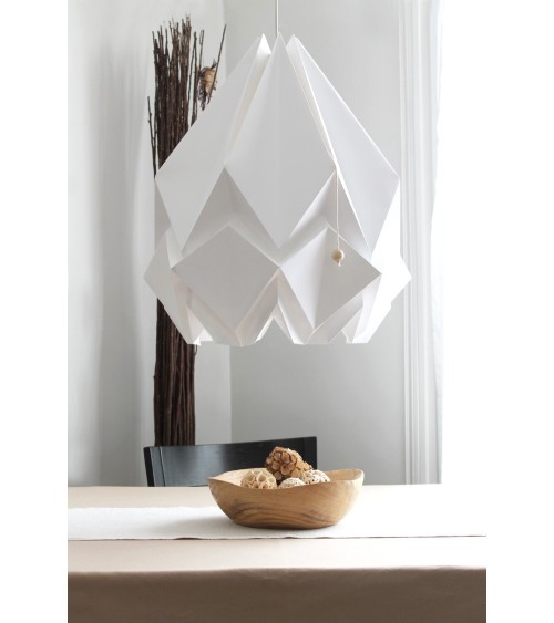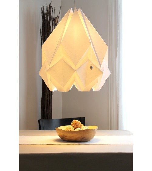 La suspension HANAHI est inspirée des techniques de l'origami et apporte de la légèreté à votre espace. Cet abat.jour aux lignes géométriques douces se combine parfaitement avec différents styles et atmosphères.Cette belle suspension pliée à la main trouvera facilement sa place dans un salon ou dans nimporte quelle pièce avec une belle hauteur sous plafond. Cela vous aidera à créer une atmosphère chaleureuse et confortable. Nos suspensions HANAHI sont faites en PAPIER de haute qualité, sans acides, produit en France avec des fibres végétales issues de lexploitation responsables des forêts (labelle FSC®).Le papier, matériau recyclage par excellence, correspond entièrement à notre démarche de développement durable ! Et cest exactement pour cette raison que notre papier nest pas traité anti.feu ou imperméabilisé. Ces traitements empêchent le recyclage à 100 pour cent du papier et sont très nocifs. Lutilisation de ce genre de produits chimiques est contraire à notre philosophie et engagement pour lenvironnement. Nos suspensions en papier sont à utiliser à lintérieur et de préférence dans des pièces peu humides. Et surtout uniquement avec des ampoules LED. Le câble électrique n'est pas fourni avec la suspension. Les suspensions Hanahi sont à utiliser uniquement avec des ampoules LED. Douille E27. Lampoule nest pas fournie.Vous recevez le luminaire HANAHI déjà monté et prêt à être installé avec des instructions. Le luminaire est conçu pour être utilisé avec une ampoule LED. Nos luminaires origami sont très faciles à nettoyer. Vous pouvez utiliser soit un plumeau ou de l'air comprimé, dès qu'à partir d'au moins 30 cm de distance.