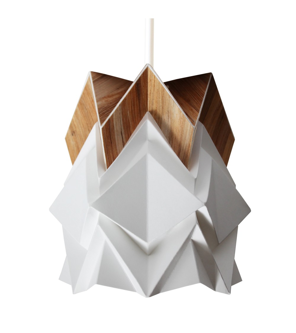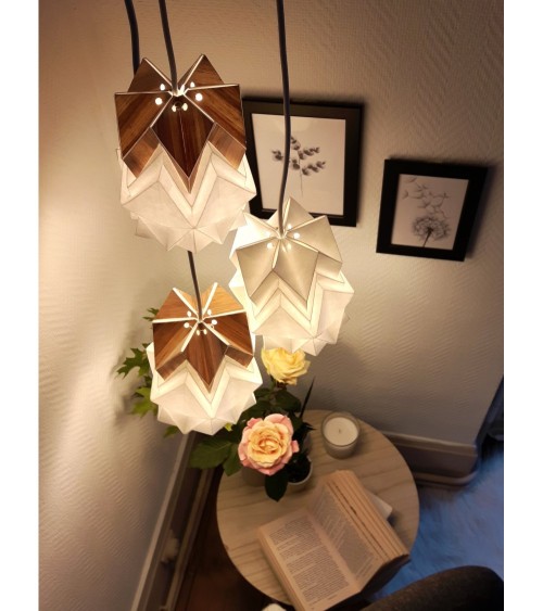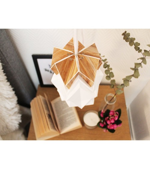 La petite suspension HOUSEKI est inspirée des techniques de l'origami et apporte de la légèreté à votre espace. Ce petit abat-jour aux lignes géométriques douces se combine parfaitement avec différents styles et atmosphères.EcoWood est un placage exotique issu du recyclage de troncs de bananier. Vu que le bananier est une herbe géante et non un arbre, il atteint sa taille maximale tous les 9 mois et, une fois les bananes récoltées, le tronc se décompose naturellement. Mise au point par une entreprise Française ce processus permet de créer un magnifique placage très écologique, alternatif au bois empêchant la déforestation. Nous utilisons du PAPIER FSC® de haute qualité, sans acides, produit en France avec des fibres végétales issues de lexploitation responsables des forêts.Notre papier nest pas traité anti-feu ou imperméabilisé. Ces traitements à base de produits chimiques sont très nocifs empêchant le recyclage total du papier ce qui est contraire à nos engagements pour lenvironnement. Nos suspensions en papier sont à utiliser à lintérieur et de préférence dans des pièces peu humides. Vous recevez l'applique monté et prêt à être installé avec des instructions. Support mural non compris. Nos produits sont à utiliser uniquement avec des ampoules LED. Douille E27. Lampoule et le câble électrique ne sont pas fournis.Pour nettoyer votre suspension vous pouvez utiliser un plumeau ou de l'air comprimé, dès qu'à partir d'au moins 30 cm de distance.