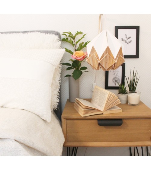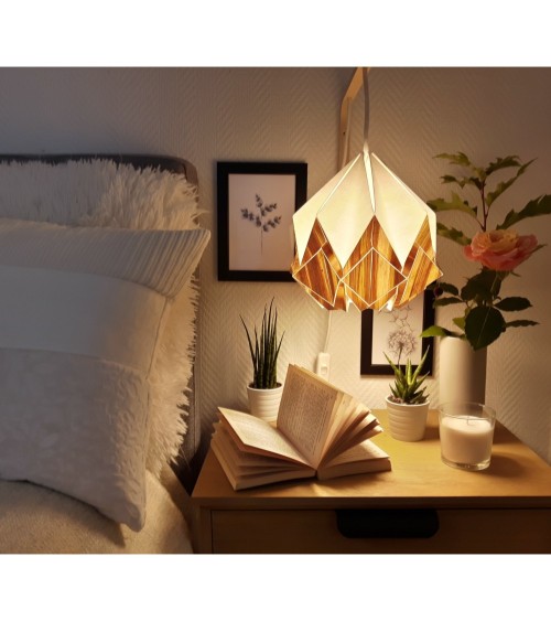 La suspension HANAHI est inspirée des techniques de l'origami et apporte de la légèreté à votre espace. Cet abat-jour aux lignes géométriques douces se combine parfaitement avec différents styles et atmosphères.Cette belle suspension pliée à la main trouvera facilement sa place sur votre table de chevet, celle de la chambre de vos enfants ou de tout autre espace. Ses dimensions sont également parfaites pour une combinaison de multiples abat-jours.Cela vous aidera à créer une atmosphère chaleureuse et confortable._x000D_ _x000D_DIMENSIONS _x000D_S - 25cm de diamètre X 24cm de haut (idéal pour table de chevet ou pour faire des combinaisons de plusieurs suspensions)_x000D_ _x000D_KIT CABLE_x000D_Le câble électrique n'est pas fourni avec la suspension. _x000D_ _x000D_AMPOULES_x000D_Les suspensions Hanahi sont à utiliser uniquement avec des ampoules LED. Douille E27._x000D_Lampoule nest pas fournie._x000D_ _x000D_LE PRODUIT_x000D_Vous recevez le luminaire HANAHI déjà monté et prêt à être installé avec des instructions._x000D_Le luminaire est conçu pour être utilisé avec une ampoule LED._x000D_ _x000D_MATERIAUX_x000D_EcoWood_x000D_Est un placage exotique issu du recyclage de troncs de bananier._x000D_Vu que le bananier est une herbe géante et non un arbre, il atteint sa taille maximale tous les 9 mois et, une fois les bananes récoltées, le tronc se décompose naturellement. _x000D_Mise au point par une entreprise Française ce processus permet de créer un magnifique placage très écologique, alternatif au bois empêchant la déforestation._x000D_ _x000D_Papier_x000D_Nous utilisons du PAPIER FSC® de haute qualité, sans acides, produit en France avec des fibres végétales issues de lexploitation responsables des forêts. _x000D_Notre papier nest pas traité anti-feu ou imperm