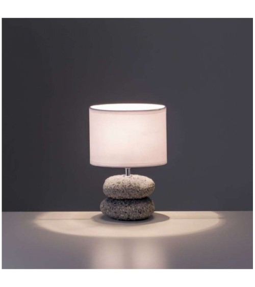Petite lampe à poser avec base galets et abat-jour tissu blanc. Esprit bord de mer / esprit zen.Dimensions: Hauteur 24cm x diamètre 16.5cmLongueur Câble: 120cmMatière: Céramique et TissuCouleur: Gris/Noir et BlancAmpoule: E14 / 40W (non fournie)