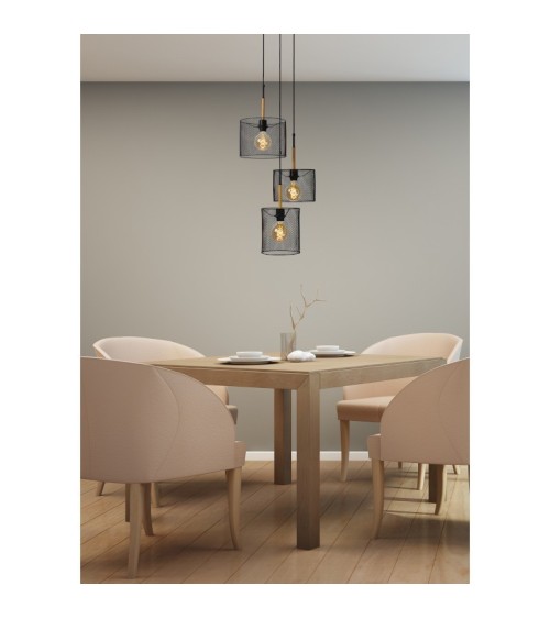 Les caractéristiques techniquesCette suspension lumineuse est en métal noir mat et bois. La suspension Baskett fonctionne avec 3 ampoules E27 60 W maximum, non fournies, ce qui vous permet de choisir température de couleur et intensité lumineuse de votre éclairage selon vos goûts.Les avantages esthétiquesVous aimerez le parti pris innovant de cette suspension intérieure conçue par la maison Lucide, spécialiste belge du luminaire depuis plus de 25 ans. Les 3 abat-jour cylindriques en résille métallique de tailles différentes en font un objet décoratif unique qui allie sobriété, originalité et esprit résolument contemporain. Ses matériaux se marieront parfaitement avec une décoration de style industriel. Ce luminaire éclairera efficacement votre pièce à vivre. Il conviendra aussi parfaitement au-dessus d'une grande table de salle à manger rectangulaire ou de l'ilot central de votre cuisine. Vous pourrez également l'installer dans une entrée cathédrale ou une cage d'escalier. Afin de renforcer l'esthétique industrielle de cette suspension, nous vous conseillons d'utiliser des ampoules à filament.La gamme Baskett vous propose 2 suspensions (3 et 4 points lumineux) et 1 applique murale