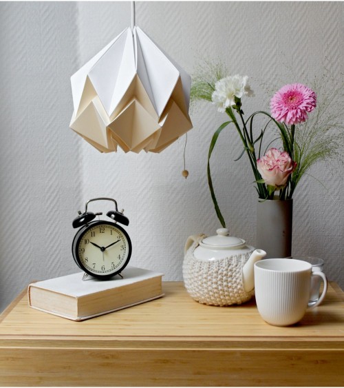 La suspension HANAHI est inspirée des techniques de l'origami et apporte de la légèreté à votre espace. Cet abat-jour aux lignes géométriques douces se combine parfaitement avec différents styles et atmosphères.Cette belle suspension pliée à la main trouvera facilement sa place sur votre table de chevet, celle de la chambre de vos enfants ou de tout autre espace. Ses dimensions sont également parfaites pour une combinaison de multiples abat-jours. Cela vous aidera à créer une atmosphère chaleureuse et confortable Nos suspensions sont faites en PAPIER de haute qualité, sans acides, produit en France avec des fibres végétales issues de lexploitation responsables des forêts (labelle FSC®).Notre papier nest pas traité anti-feu ou imperméabilisé. Ces traitements empêchent le recyclage à 100% du papier et sont très nocifs. Lutilisation de ce genre de produits chimiques est contraire à nos engagements pour lenvironnement. Nos suspensions en papier sont à utiliser à lintérieur et de préférence dans des pièces peu humides. Le câble électrique n'est pas fourni avec la suspension.Les suspensions HANAHI sont à utiliser uniquement avec des ampoules LED exclusivement. Douille E27. Lampoule nest pas fournie.Vous recevez la suspension déjà montée et prêt à être installée avec des instructions.Pour nettoyer votre suspension vous pouvez utiliser un plumeau ou de l'air comprimé, dès qu'à partir d'au moins 30 cm de distance.