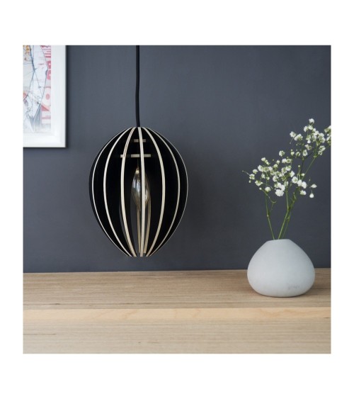 Lampe suspension bois et béton frêne teinté noir cordon noir