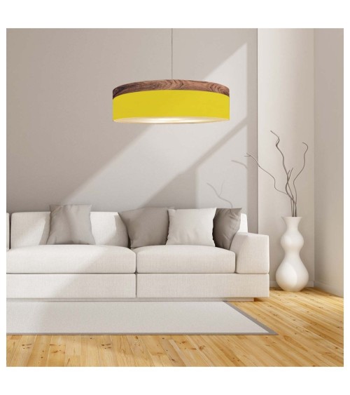 Produits à usage professionnels et particuliers. La suspension Boobby Slim est un plafonnier moderne et coloré, parfait pour donner une touche d'originalité à n'importe quelle pièce de votre maison. Elle est composée d'un abat-jour de 65cm de diamètre et de 20cm de hauteur, ce plafonnier est recouvert d'un tissu imprimé avec une couleur unie et en haut un imprimé trompe l'il effet bois qui ajoute une touche de style et de sophistication. La suspension est alimentée par un système d'ampoule LED fournie et elle est livrée avec son câble d'alimentation garni en tissus blanc de 100 cm réglable en hauteur et une platine en métal blanc. Pour obtenir une lumière diffuse et chaleureuse, nous fournissons un diffuseur en dessous. Cette suspension est idéale pour illuminer une chambre, un salon ou un bureau.