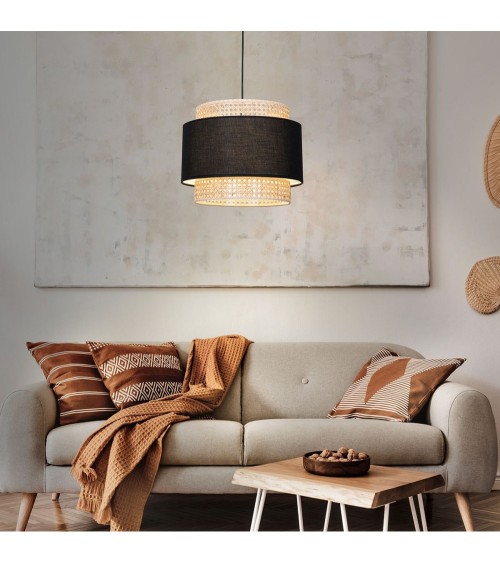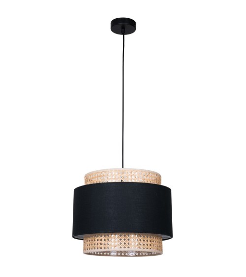Le mariage parfait entre l'exotisme du cannage naturel et la douceur du tissu noir, découvrez cette belle suspension de la collection ART. Moderne et à la fois bohème, on adore l'empiècement des deux cylindres pour un rendu lumineux hyper tendance. Idéale dans une entrée ou dans un salon, cette suspension trouvera aussi sans aucun doute sa place au-dessus d'une table à manger ou dans une chambre pour une ambiance cocooning. Luminaire équipé d'une douille E27 compatible avec une ampoule d'une puissance maximale de 40W (ampoule non incluse). Dimensions : hauteur minimale totale 100cm x diamètre 35cm. Existe également dans la même collection ART en coloris blanc ou bien en version lampe à poser ou applique murale. Les plus du produit : Matière naturelle - Effets lumineux - Ampoule à personnaliser Caractéristiques : - Douille : E27 - Puissance : 40W - IP : 20 - Matière : canage