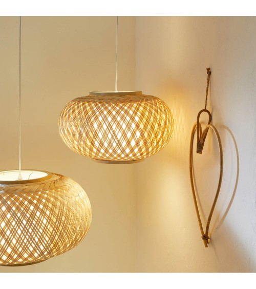 Un design organique et une élégance brute. Craquez sans plus attendre pour le charme authentique de cette suspension de la gamme NATURAL. Fabriqué en bambou naturel, ce luminaire moderne s'inscrit complètement dans la tendance du moment. Avec sa structure ovale et ajourée, cette suspension vous procurera une belle lumière douce et chaleureuse au quotidien avec des effets lumineux surprenants une fois la nuit tombée. Dans votre salon pour sublimer votre décoration d'intérieur, au-dessus de votre table à manger pour illuminer vos instants de vie ou bien dans votre chambre pour créer une ambiance cocooning, la suspension NATURAL trouvera sans aucun doute sa place dans votre aménagement intérieur. Luminaire équipé d'une douille E27 compatible avec une ampoule d'une puissance maximale de 60W (ampoule non incluse). Dimensions : diamètre 40cm x longueur câble 150cm. Existe également dans la même gamme NATURAL en diamètre 50cm pour un rendu lumineux plus imposant. Les plus du produit : Effets lumineux - Lumière tamisée - Ampoule à personnaliser Caractéristiques : - Douille : E27 - Puissance : 60W - IP : 20 - Matière : bamboo