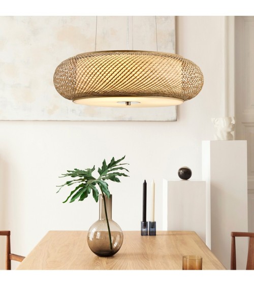 Illuminez votre aménagement intérieur avec cette belle suspension de la gamme EOLI conçue en bambou naturel. Sa forme arrondie vous fera profiter d'une lumière homogène dans toute votre pièce. On adore : son diffuseur opale blanc discret qui vous procurera un bel éclairage chaleureux pour une ambiance cocooning assurée au quotidien. Idéale dans un salon ou bien au-dessus de votre table à manger, la suspension EOLI sera tout aussi parfaite dans une entrée pour un rendu lumineux plus fonctionnel. Luminaire équipé de trois douilles E27 compatibles avec 3 ampoules d'une puissance maximale de 60W chacune, soit 3x60W (ampoules non incluses). Dimensions : diamètre 50cm x hauteur 15cm x hauteur avec câble 150cm. Hauteur réglable. Existe également dans la même collection EOLI en version applique murale ou plafonnier. Les plus du produit : Matière naturelle - Lumière tamisée - Ampoule à personnaliser Caractéristiques : - Douille : E27 - Puissance : 60W - IP : 20 - Matière : bamboo