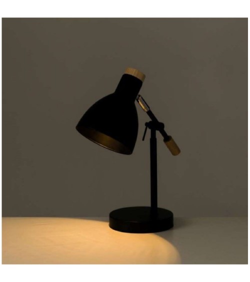 Lampe de bureau en métal noir et bois orientable. Dimensions: Hauteur 36.5cm x diamètre 15cm x Longueur 32cm.Ampoule: E14/25W (non fournie)Couleur: Noir et BoisMatière: Bois, Métal