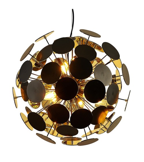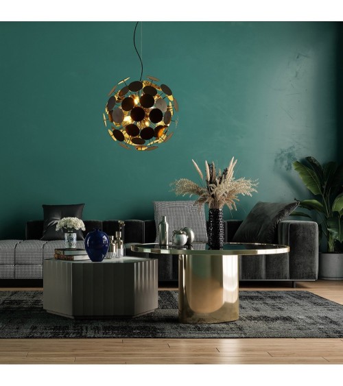 Envie d'arrondir les angles dans votre déco ? La suspension design BUBBLE est le complice idéal de votre éclairage de plafond ! Cette superbe suspension boule apportera beaucoup de douceur dans votre intérieur tout en diffusant un éclairage extrêmement chaleureux. Conçus en métal noir à l'extérieur, les cercles qui la composent ont une finition dorée qui vient réfléchir la lumière pour lui donner une teinte solaire très agréable. Avec un joli diamètre de 54 cm, cette suspension design trouvera sa place dans n'importe quelle pièce de vie de la maison, même la cuisine - sa matière métal est résistante et facile à nettoyer. Dimensions : hauteur 150 cm x diamètre 54 cm x profondeur 30 cm. Hauteur réglable. Existe dans la même série en plafonnier. Les plus du produit : Matériau résistant - Intérieur doré - Effets lumineux Caractéristiques : - Douille : E14 - Puissance : 40W - IP : 20 - Matière : metal
