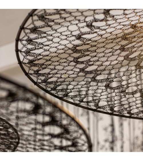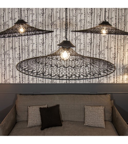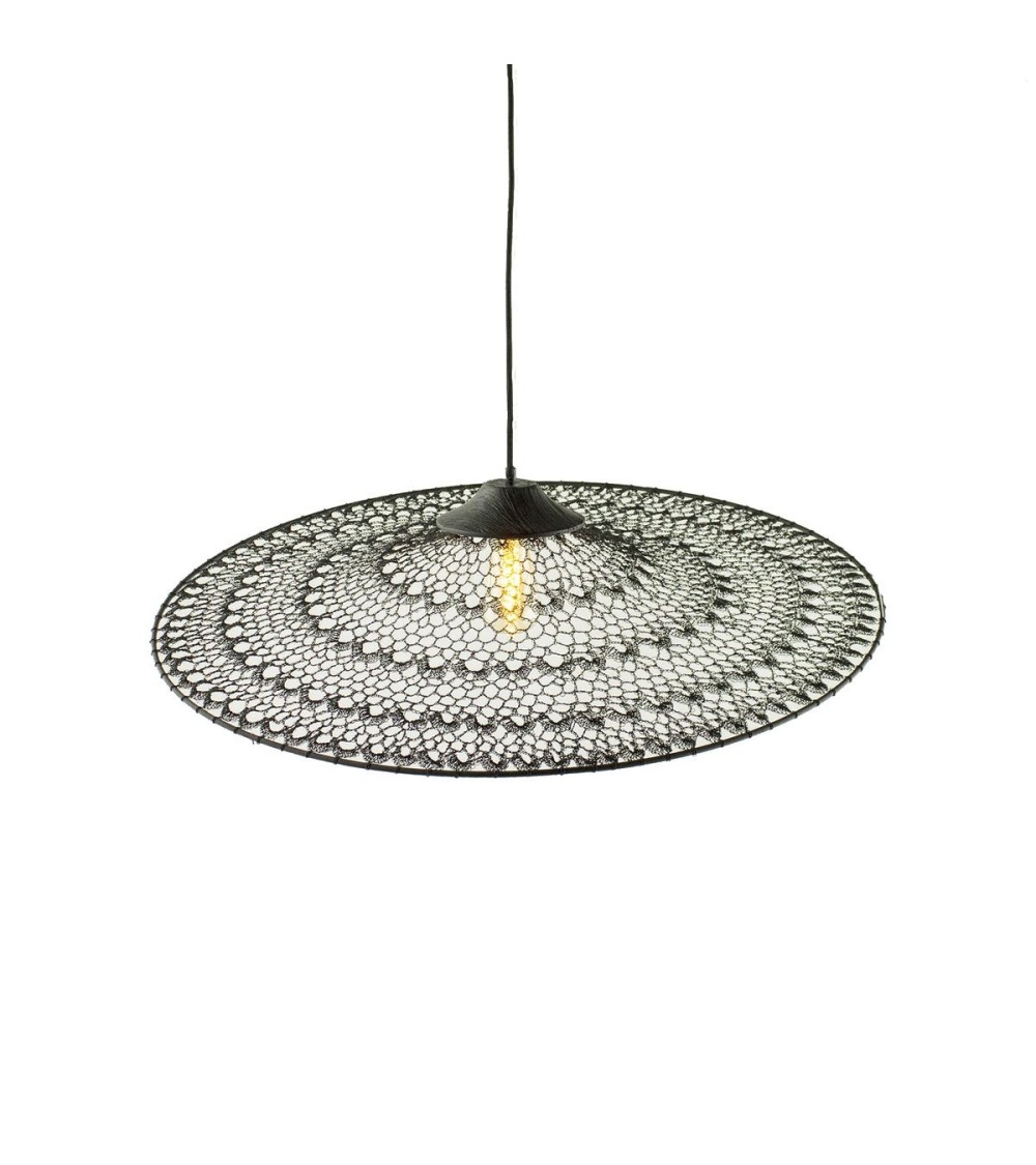 Optez pour la suspensions en cuivre en maille crochetée à la main pour votre intérieur! Elle apportera de l'originalité et de l'élégance à votre pièce tout en apportant une touche chaleureuse grâce à sa petite touche boisée. Laissez vous tenter par une ampoule filière afin d'apporter une touche de contemporain à la suspension, la lumière se filtrera et laissera passer de jolies rayons lumineux à travers les mailles. Suspension en métal noir crocheté et bois Câble électrique inclus longueur : 180cm Nuances de noir Dimensions du produit : 80X80X13 cm Produit fait main