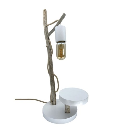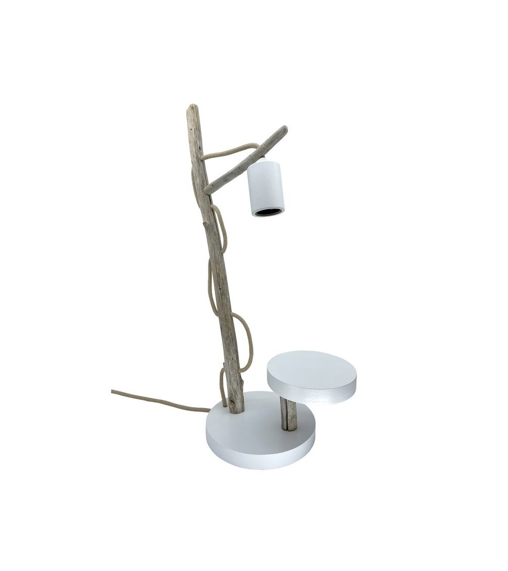 La lampe à poser avec tablette KALT est épurée avec sa potence en bois flotté et son ampoule à vue.La base et la tablette sont rondes de 20 et 18 cm de diamètre, en panneau de fibre peint en blanc tout comme le cache douille en bois de couleur identique. La Potence en bois flotté de 60 cm de hauteur est traversée de part en part d'un fil électrifié recouvert de jute normé CE de 150 cm de longueur. La douile E27 nécessitera une ampoule vintage LED dorée de 9 watt non fournie.C'est la lampe qui éclairera de son style bord de mer, votre espace lecture dans le salon et vous permettra de poser votre téléphone sur sa tablette.CocArt Créations, est une marque française de luminaires dinspiration bord de mer, fabriqués à la main en France dans l'atelier Blésois, à partir de matériaux recyclés tels que les bois flottés.Notez qu'il peut y avoir quelques différences entre les visuels proposés et la lampe que vous recevrez. La fabrication artisanale confère un caractère unique à chaque création.Toutes les lampes créées par CocArt Créations sont des luminaires de classe II, pourvus de matériels électriques marqués CE. Ils sont équipés disotop, dembouts de protection, ou disodom conformément à la norme EN 60598.