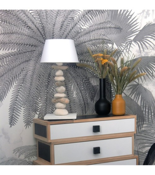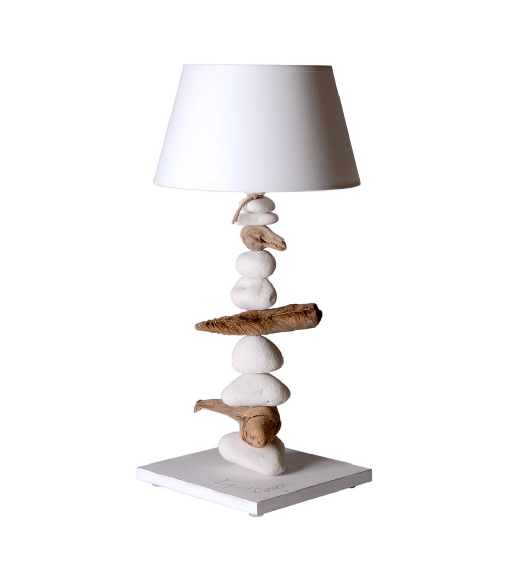 Cette lampe à poser apportera un air marin à votre salon, idéale sur une console ou un bureau. Peu encombrante avec sa base de 20 cm² qui est en en panneau de fibre peint à la main et son abat-jour de 24 cm de diamètre de forme américaine qui est en cotonette de couleur assortie à la base. Le corps de la lampe est un empilement de galets et de bois flottés. La hauteur totale du luminaire (de la base à l'abat-jour) est de 50 cm.Le cordon de 2 m est blanc avec un interrupteur. La douille E27 pourra accueillir une ampoule Led 10 watt maximum, non fournie.CocArt Créations, est une marque française de luminaires dinspiration bord de mer, fabriqués à la main en France dans l'atelier Blésois, à partir de matériaux recyclés tels que les bois flottés.Notez qu'il peut y avoir quelques différences entre les visuels proposés et la lampe que vous recevrez. La fabrication artisanale confère un caractère unique à chaque création.Toutes les lampes créées par CocArt Créations sont des luminaires de classe II, pourvus de matériels électriques marqués CE. Ils sont équipés disotop, dembouts de protection, ou disodom conformément à la norme EN 60598.Composition détaillée : base en panneau de fibre peint, galets, bois flotté, abat-jour en cotonette