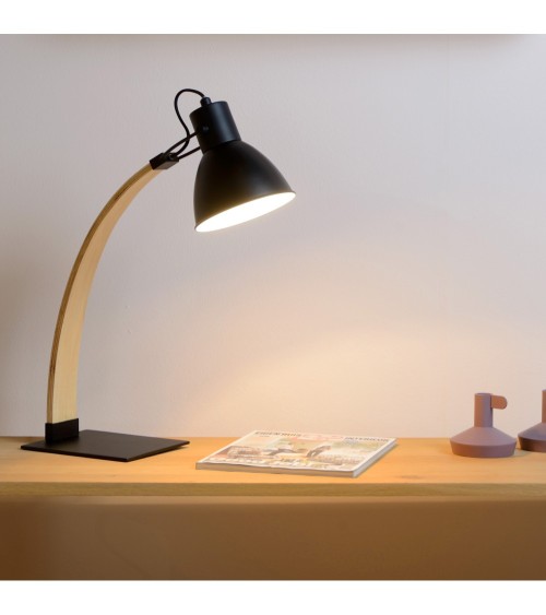 Un charme scandinave et un look minimaliste, craquez pour cette belle lampe de bureau de la collection CURF. Fabriquée entièrement en métal dans un beau mariage de couleur bois et noir, elle instaurera une touche chaleureuse moderne dans votre décoration intérieure. Parfaite dans votre bureau pour illuminer vos journées de travail ou vos activités quotidiennes, cette lampe à poser trouvera aussi sans aucun doute sa place dans un coin de votre salon ou de votre salle à manger en éclairage d'accompagnement, ou bien en guise de lampe de chevet dans votre chambre à coucher. Le plus ? Pour un éclairage 100% fonctionnel au quotidien, cette lampe de bureau possède un abat-jour rotatif verticalement à adapter en fonction de vos besoins au cours de la journée. Luminaire équipé d'une douille E27 compatible avec une ampoule d'une puissance maximale de 60W (ampoule non incluse). Dimensions : hauteur 54cm (hauteur non réglable) x profondeur 40cm x hauteur abat-jour 10cm x diamètre abat-jour 15cm x longueur câble 150cm. Interrupteur sur câble d'alimentation. Existe également dans la même collection CURF en coloris blanc ou bien en version lampadaire (dans les deux coloris). Les plus du produit : Matériau résistant - Effets lumineux - Ampoule à personnaliser Caractéristiques : - Douille : E27 - Puissance : 60W - IP : 20 - Matière : BOIS