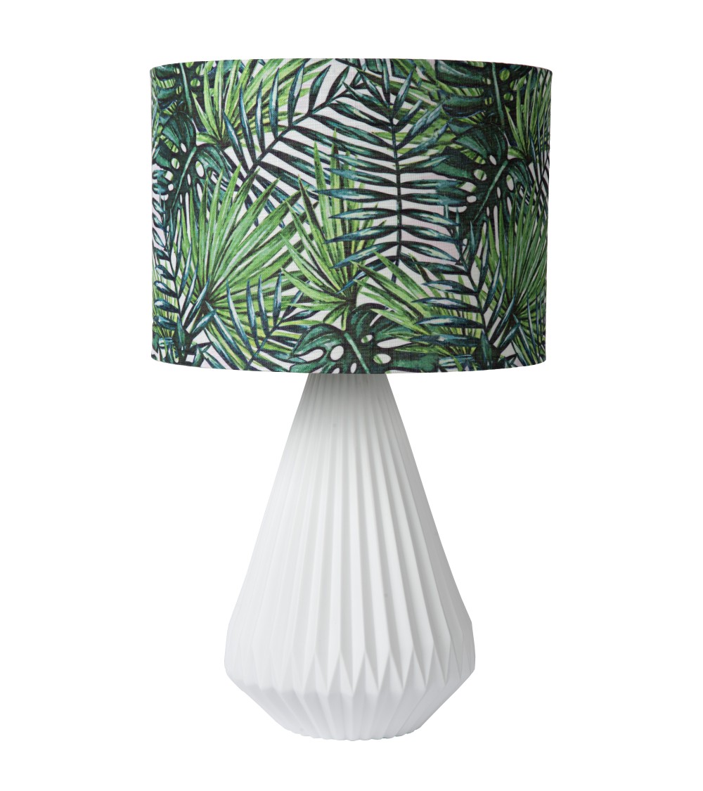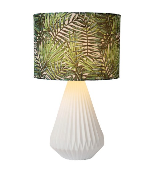 Laissez-vous porter par le charme amazonien de cette belle lampe de table SERENOA ! Conçue sur un pied en porcelaine blanche avec des striures pour donner du volume à ce luminaire, elle possède également un superbe abat-jour de forme cylindre fabriqué en tissu avec des imprimés d'inspiration jungle. Cette lampe à poser SERENOA trouvera sans aucun doute sa place dans votre quotidien et vous procurera un éclairage doux et chaleureux. Idéale dans un salon en guise de décoration ou sur une commode dans votre entrée en éclairage d'accompagnement, vous trouverez sans aucun doute une place à cette lampe. Luminaire équipé d'une douille E27 compatible avec une ampoule d'une puissance maximale de 25W (ampoule non incluse). Dimensions : hauteur 58.5cm x hauteur abat-jour 25cm x diamètre 35cm x longueur câble 150cm. Interrupteur sur câble d'alimentation. Les plus du produit : Matériau résistant - Effets lumineux - Ampoule à personnaliser Caractéristiques : - Douille : E27 - Puissance : 25W - IP : 20 - Matière : glass
