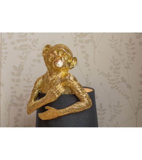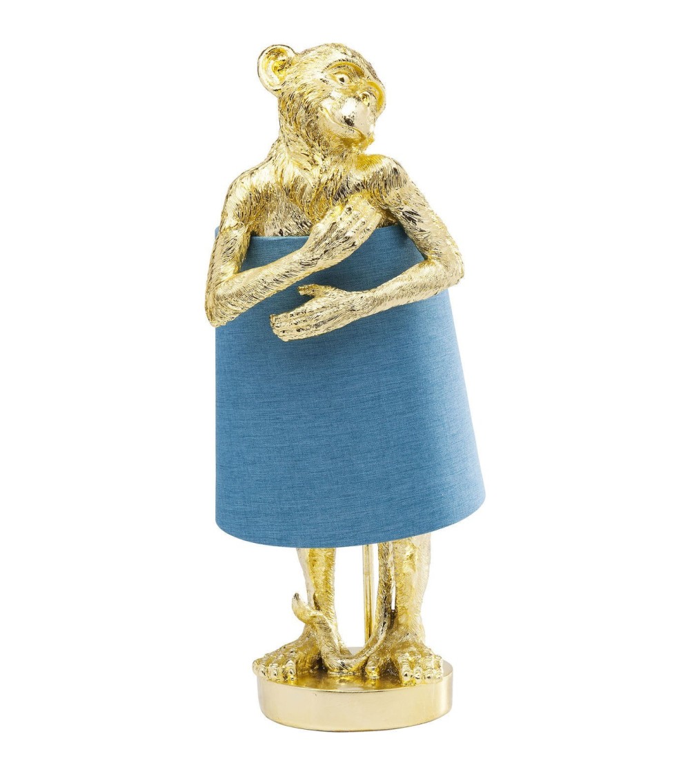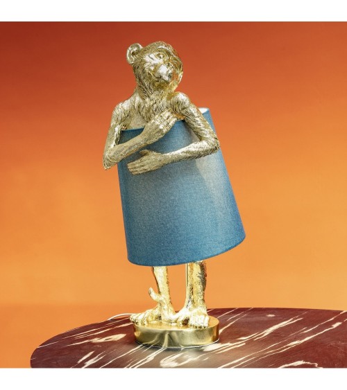 Lampe singe doré en polyrésine et abat-jour en lin bleu
