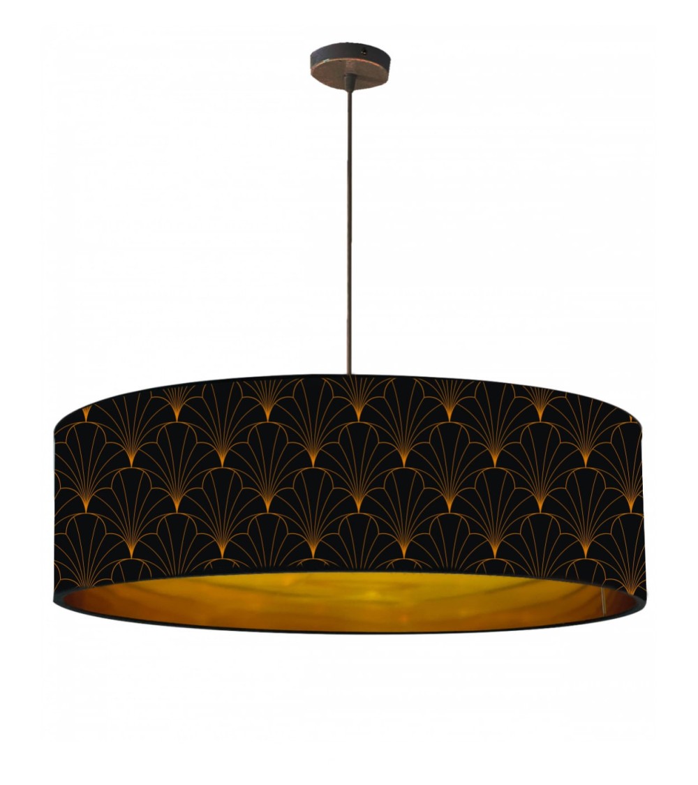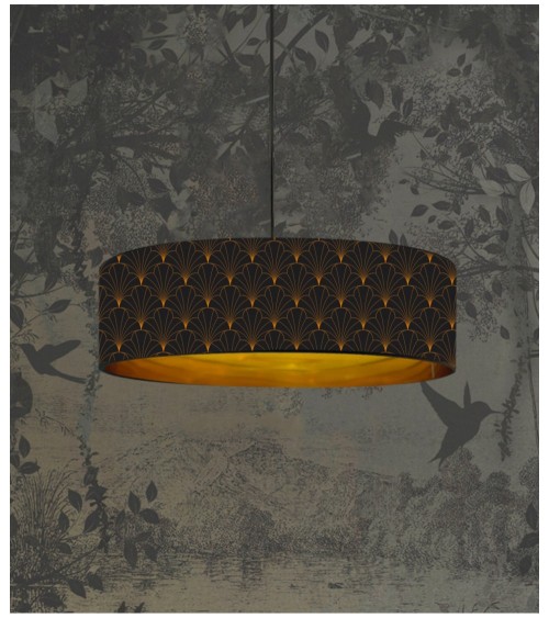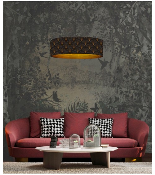Produits à usage professionnels et particuliers. La Suspension de la gamme Goldy est fabriquée en PVC laqué intérieur et extérieur de couleur or. Cette suspension est imprimée d'un motif noir sur fond de PVC or laqué, lui donnant un aspect moderne et élégant. De plus, lorsqu'elle est allumée, la suspension renvoie une lumière métallisée très tendance qui se marie parfaitement aux motifs dorés. Cette suspension est idéale pour un éclairage d'ambiance et conviendra parfaitement pour être installée en décoration au-dessus d'une table, dans une cuisine ou dans un salon. Elle mesure 65 cm de diamètre et 28 cm de hauteur et est fournie avec une platine de plafond, un câble de 80 cm et une douille E27. Elle nécessite une ampoule LED avec un culot E27 et est destinée à un usage intérieur uniquement.