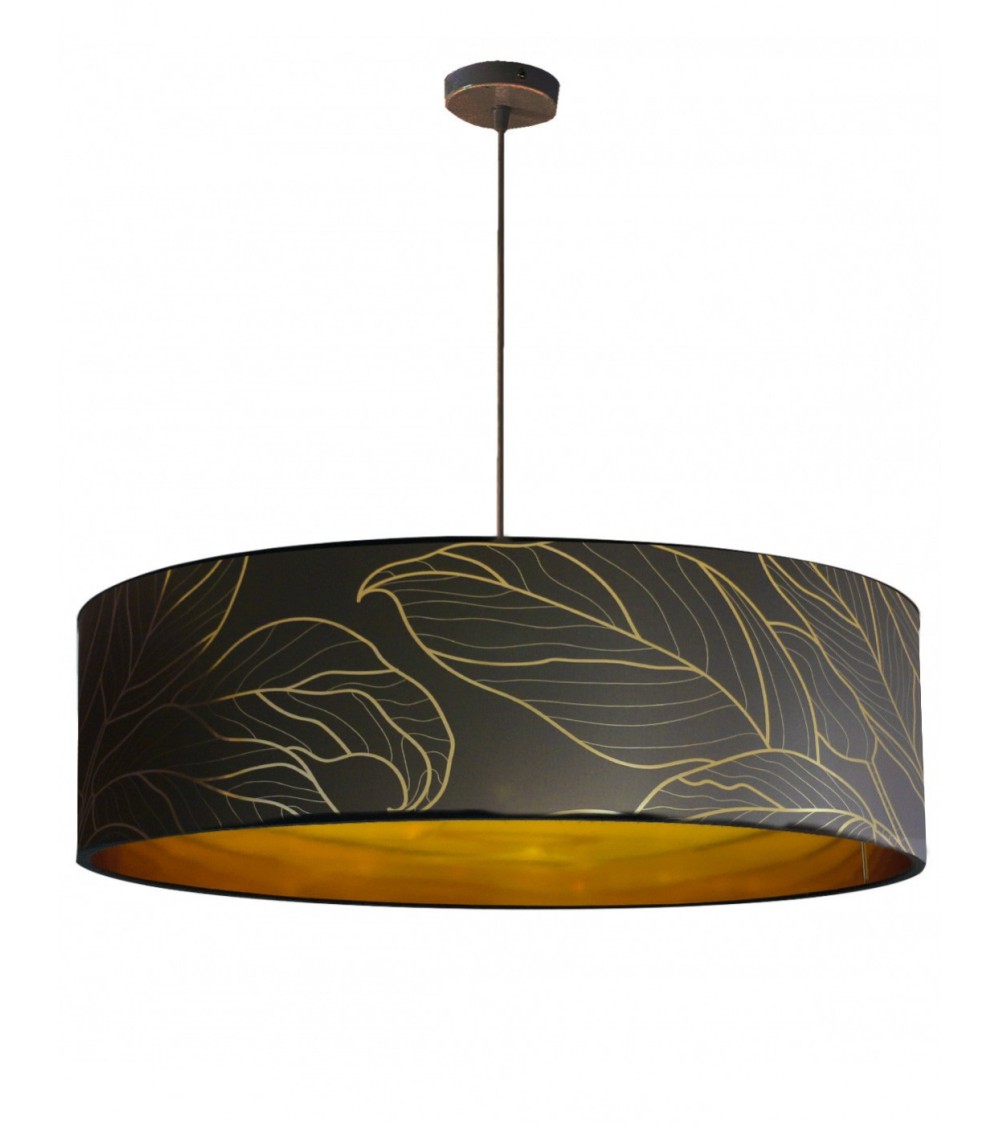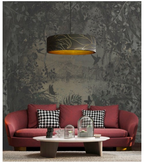 Produits à usage professionnels et particuliers. La Suspension de la gamme Goldy est fabriquée en PVC laqué intérieur et extérieur de couleur or. Cette suspension est imprimée d'un motif noir sur fond de PVC or laqué, lui donnant un aspect moderne et élégant. De plus, lorsqu'elle est allumée, la suspension renvoie une lumière métallisée très tendance qui se marie parfaitement aux motifs dorés. Cette suspension est idéale pour un éclairage d'ambiance et conviendra parfaitement pour être installée en décoration au-dessus d'une table, dans une cuisine ou dans un salon. Elle mesure 65 cm de diamètre et 28 cm de hauteur et est fournie avec une platine de plafond, un câble de 80 cm et une douille E27. Elle nécessite une ampoule LED avec un culot E27 et est destinée à un usage intérieur uniquement.