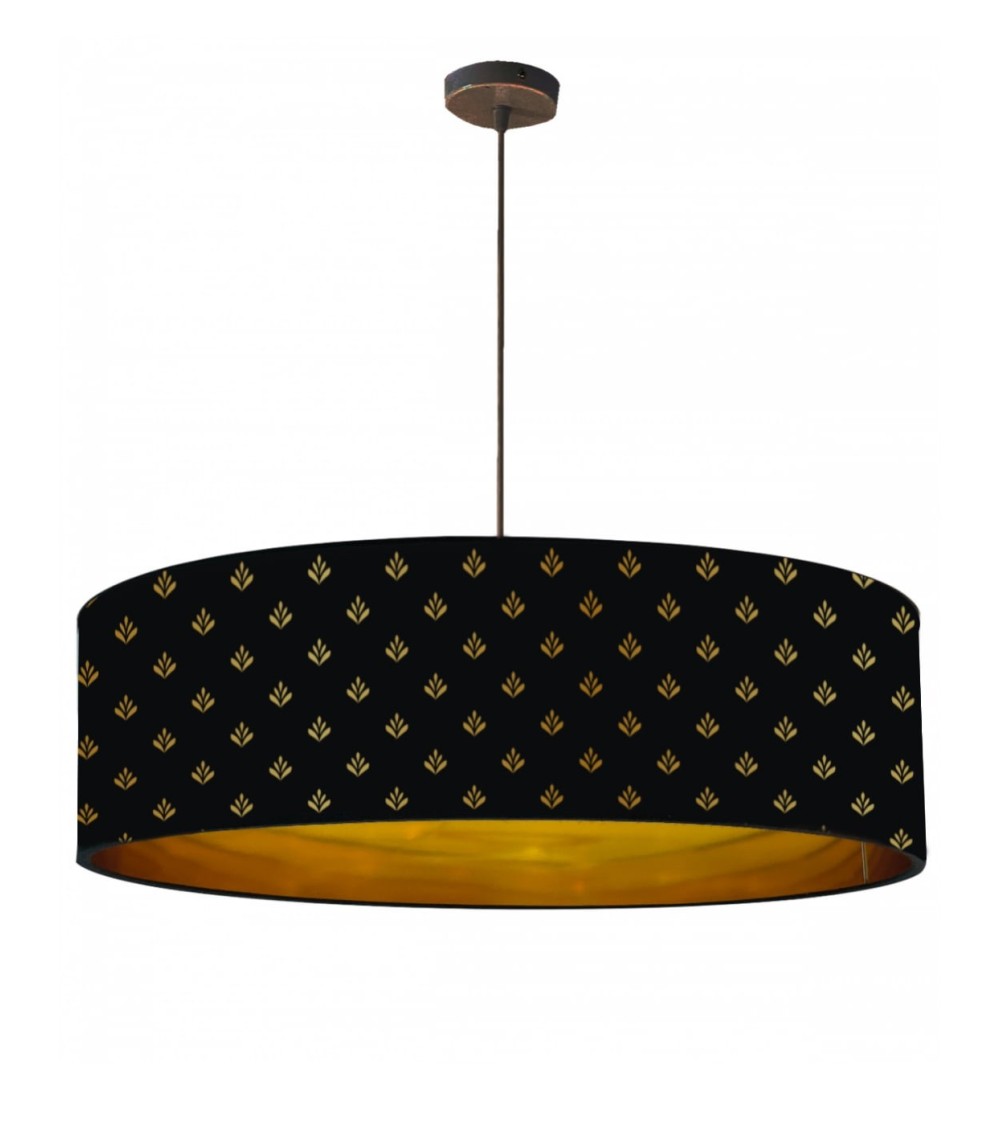 Produits à usage professionnels et particuliers. La Suspension de la gamme Goldy est fabriquée en PVC laqué intérieur et extérieur de couleur or. Cette suspension est imprimée d'un motif noir sur fond de PVC or laqué, lui donnant un aspect moderne et élégant. De plus, lorsqu'elle est allumée, la suspension renvoie une lumière métallisée très tendance qui se marie parfaitement aux motifs dorés. Cette suspension est idéale pour un éclairage d'ambiance et conviendra parfaitement pour être installée en décoration au-dessus d'une table, dans une cuisine ou dans un salon. Elle mesure 65 cm de diamètre et 28 cm de hauteur et est fournie avec une platine de plafond, un câble de 80 cm et une douille E27. Elle nécessite une ampoule LED avec un culot E27 et est destinée à un usage intérieur uniquement.
