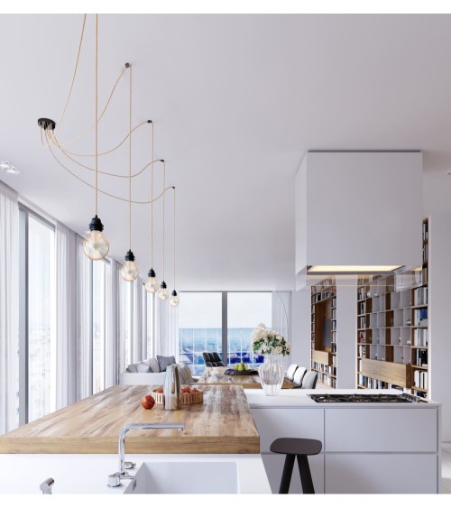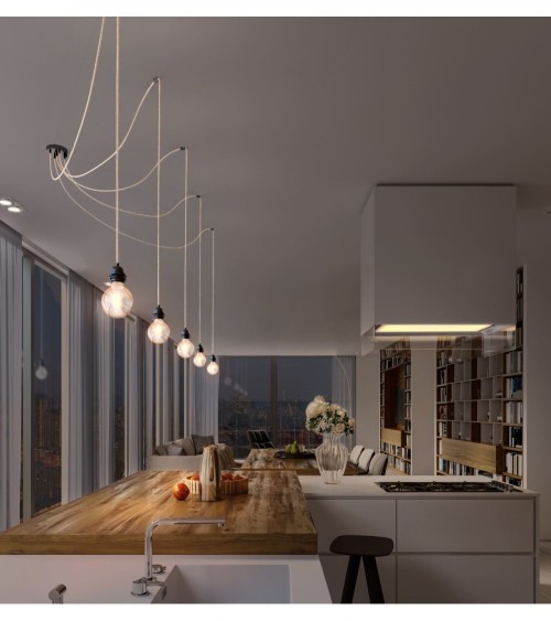 DESIGN MODERNE ET INTEMPOREL : Lignes élégantes et épurées, la suspension Hang 5 est un mélange subtile dacier et de fil électrique tissé. Ce lustre trouvera idéalement sa place dans une chambre, un salon, une cuisine ou un bureau.CHOISISSEZ VOTRE STYLE : Utilisez simplement 5 belles ampoules Edison à filaments ou Led pour en faire une suspension industrielle. Transformez-là en lampe rétro, vintage en choisissant parmi les 8 coloris de cages Hoopzi ou accessoirisez avec un abat jour.MODULABLE : Avec une longueur de câbles électriques de 3,5 MÈTRES, vous serez libre dajuster la hauteur déclairage à votre convenance mais également de déporter vos points de lumières ou vous le souhaitez sur votre plafond grâce aux 5 crochets en silicone fournis.FIXEZ SANS PERCER : Si votre foyer est équipé avec un dispositif de connexion luminaire (DCL), une simple vis fournie suffira pour fixer Hang 5. Sinon, la plaque de fixation sadaptera à toutes les situations.HOOPZI LA FRENCH TOUCH QUALITATIVE : Vous apprécierez la qualité de notre luxueux câble électrique tissé ainsi que notre pavillon en acier premium. Tous les produits Hoopzi sont certifiés CE et ont été testés par un organisme indépendant FRANÇAIS.