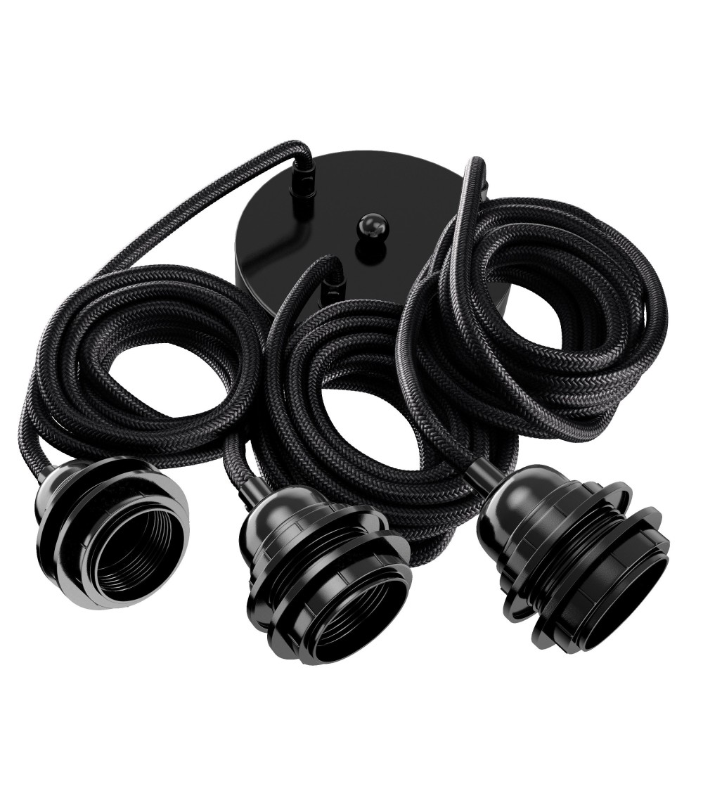 Suspension 3 fils électriques en tissu noir 2,5m douille noire