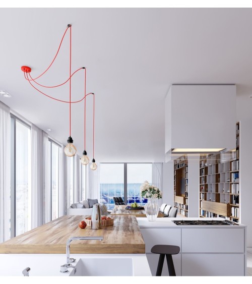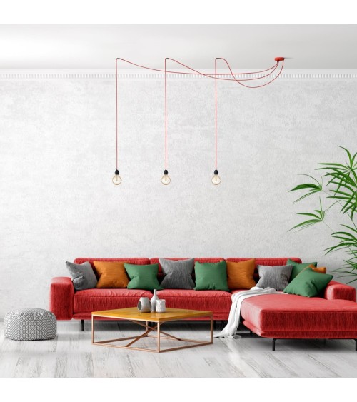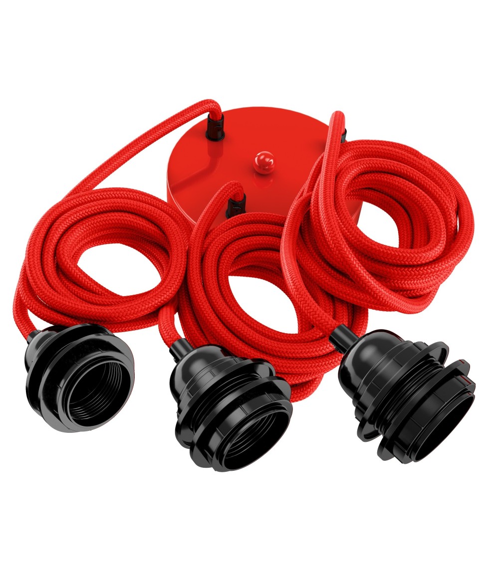 Suspension 3 fils électriques en tissu rouge 2,5m douille noire