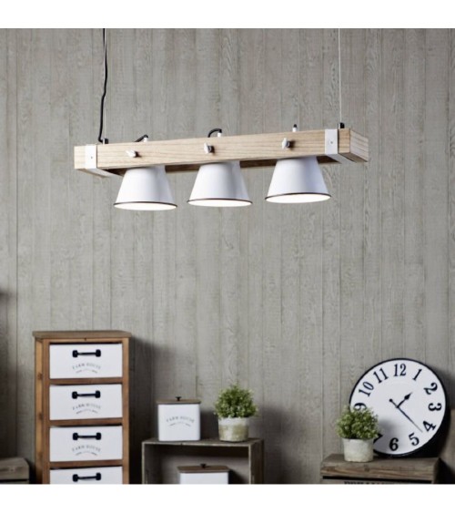 Suspension 3 lampes design Brilliant Plow Blanc Bois 82173/05. - Hauteur : 115 cm. - Longueur : 70 cm. - Profondeur : 20 cm. - Puissance : 30 . - Culot : E27 . - IP : 20 . - Nombre de point lumineux : 3 . - Poids brut : 3,978 kg. - Classe d'isolation : 1 . - Hauteur réglable : oui . - Voltage : 220 V.
