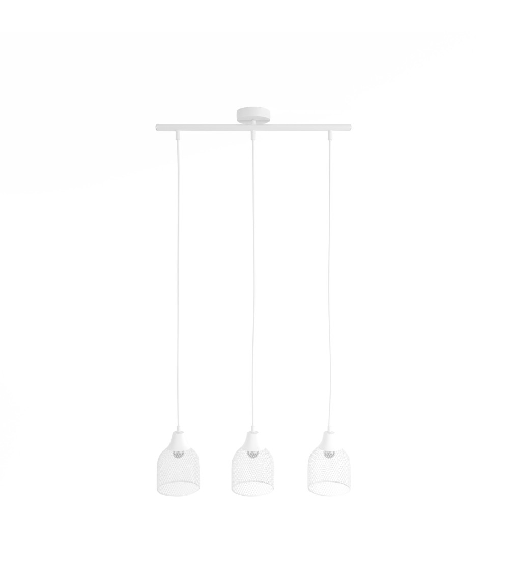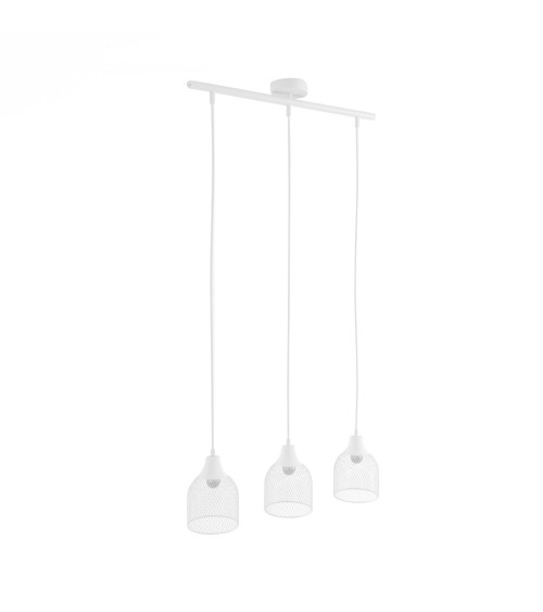 Luminaire triple suspension en métal blanc VilladoroEfficace et pleine de charme, la suspension à triple abat-jour Villadoro est le luminaire design rêvé pour éclairer en beauté table à manger, îlot central, pièce de vie. Note claire de jour comme de nuit, cette suspension triple donnera invariablement de sa bonne humeur aux moments en famille ou entre amis.Métal blancDimensionsDiamètre abat-jour : 14 cm x 19 cmLongueur maximale : 120 cmTriple suspension design en métal blanc, à taaaable?!Un bon éclairage dans la pièce à vivre fait complètement partie des critères essentiels pour se sentir bien à la maison. Autant, la pénombre illuminée par les halos des lampes à poser est savoureuse en soirée, autant, autour de la table, dans le salon, dans le séjour, un luminaire design qui propose une lumière suffisante et adaptée est indispensable. Avec la suspension à trois lampes Villadoro, pas de question à se poser. Non seulement vous trouverez que ses trois abat-jour blancs sont parfaits pour la table à manger, lîlot de cuisine, le plan de travail, mais en prime, vous ferez gagner du caractère à votre pièce.Efficace et typée, la triple suspension en métal blanc ajouré VilladoroLes 3 abat-jour en métal blanc placés en enfilade sur la suspension design Villadoro ne laisseront personne indifférent. Déco tendance à part entière, cette conception apporte un effet structurant, sans surcharge, toutefois capable dhabiller de grands volumes. Dans une vaste pièce de vie, la suspension triple design sassocie à sa sur jumelle, la suspension design Villadoro à ampoule unique. Une combinaison parfaite pour faire forte impression avec un ensemble homogène. La note claire offerte par ce luminaire suspension à 3 lampes est une aubaine pour installer un esprit de fraîcheur et de légèreté. Nhésitez pas à la régler à faible hauteur, pour mettre en scène la table mange-debout et ses tabourets, lespace de détente avec ses poufs et sa banquette.
