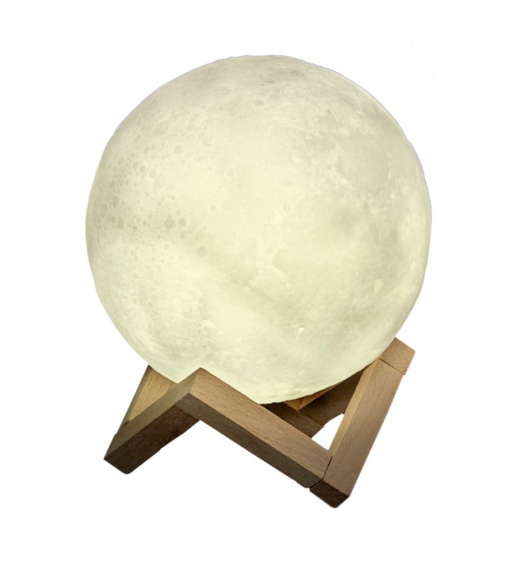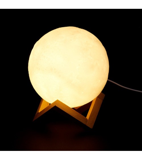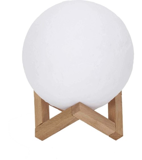 Lampe tactile lune 3 couleurs de lumière. Support en bois. Coloris : blanc Matière : plastique et bois Batterie : batterie lithium Alimentation : câble USB Dimensions : Hauteur 19 cm x Diamètre 15 cm