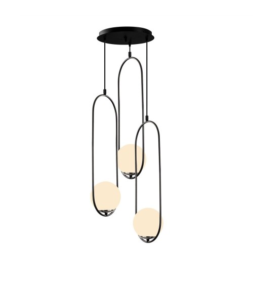 Suspension à trois lumières Garet. Design décoratif avec trois structures métalliques de forme ovale supportant trois abat-jour sphériques en verre opale. Vous pouvez régler la chute de chaque point lumineux en adaptant sa position aux dimensions de la pièce. Plafonnier moderne pour l'éclairage des salons.Dimensions : Hauteur max. 146cm. Diamètre 44 cm. Fiche technique Eclairage 3 x E27 Max. 40W. Ampoules non incluses Caractéristiques Hauteur Min : 66 Cm. Hauteur maximale : 146 cm. Diamètre : 44 cm. Finition structure : Noir Finition abat-jour : Opale Matière : Métal Autres informations Degré IP : IP20 Tension : 230V. Fréquence : 50/60 Hz. Wonderlamp est une marque visant à proposer des produits indispensables à l'éclairage LED. Il s'agit d'une sélection minutieuse et détaillée de différentes options conçues pour un éclairage complet de la pièce. Wonderlamp a une position consolidée sur les marchés les plus influents offrant un éclairage de qualité à un prix compétitif. Wonderlamp s'est imposé comme une marque de référence et très fiable sur le marché en ligne grâce à la qualité de ses produits. Une marque leader, de confiance et avec toutes les garanties.