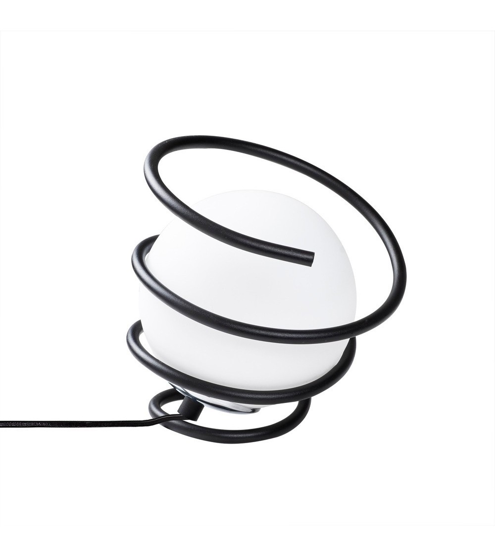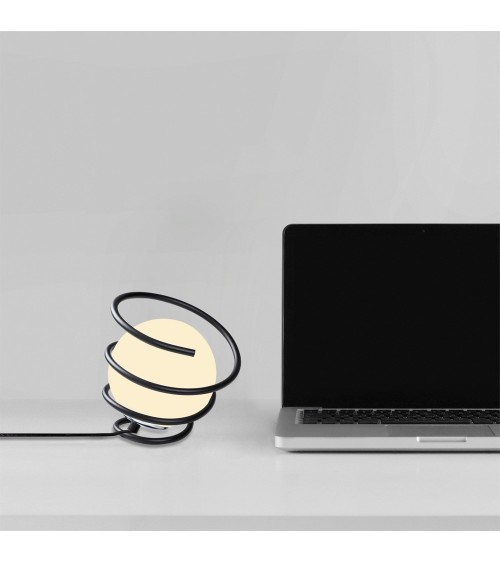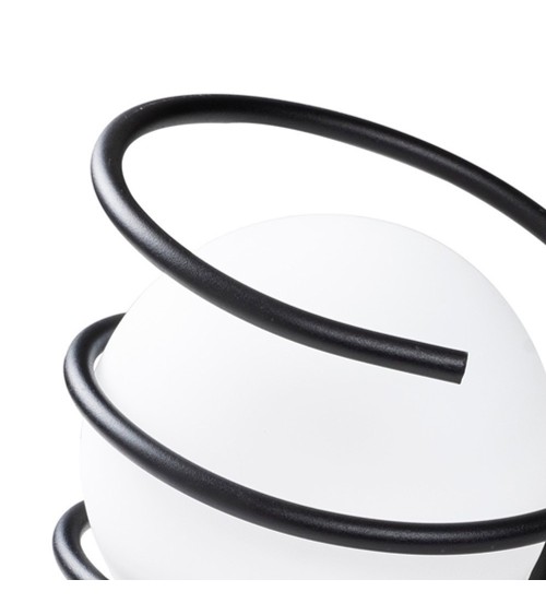 Lampe de table sphère en verre blanc entourée d'une spirale noire