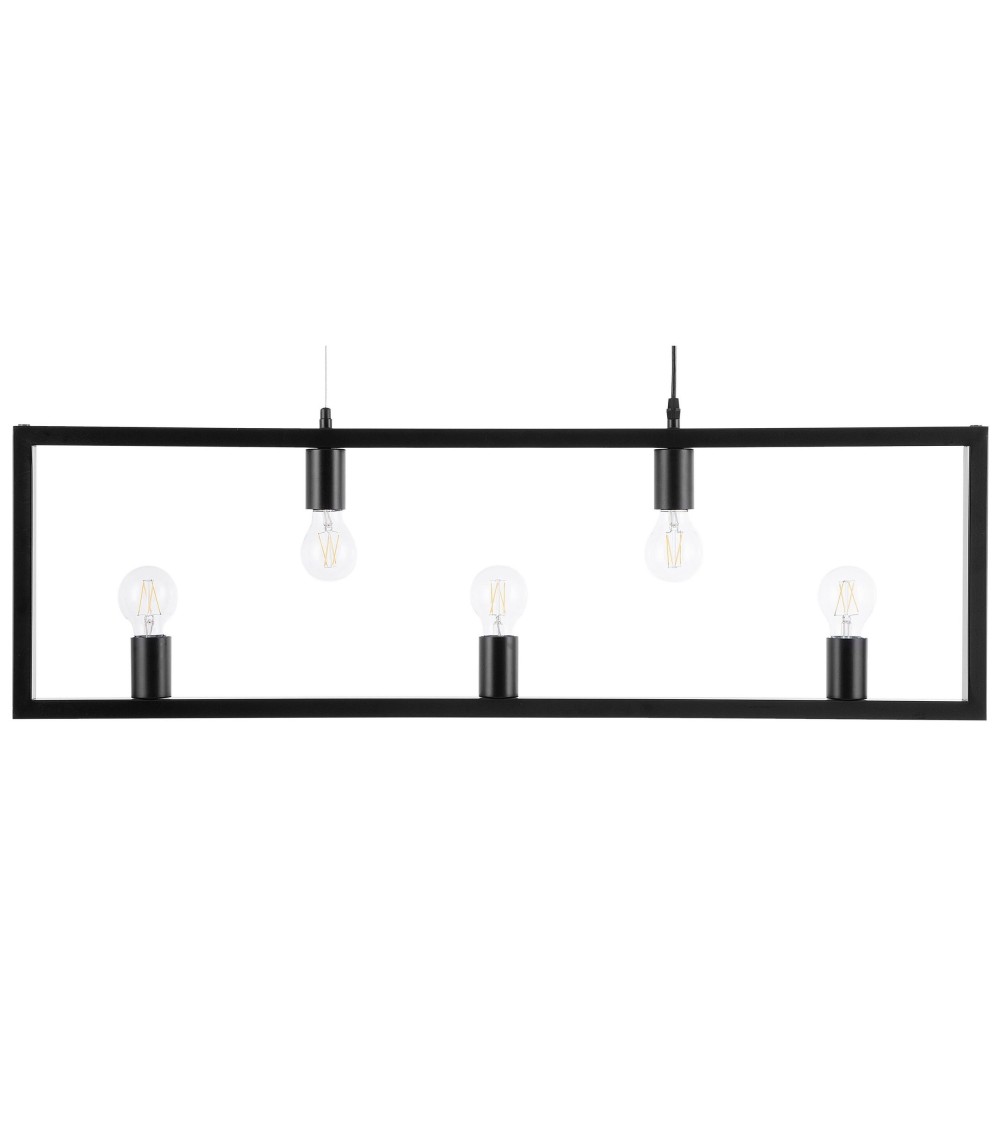 Cette lampe suspension sera l'élément décoratif phare de votre salon ! Avec son cadre rectangulaire en métal noir et ses 5 ampoules, il diffusera la lumière dans toute votre pièce avec élégance, créant ainsi une atmosphère chaleureuse. La lampe moderne trouvera sa place notamment dans un salon au-dessus d'une longue table de salle à manger, avec un décor contemporain, industriel ou vintage. La lampe est adaptée aux ampoules E27 de maximum 40 W. Les ampoules ne sont pas incluse dans l'offre.