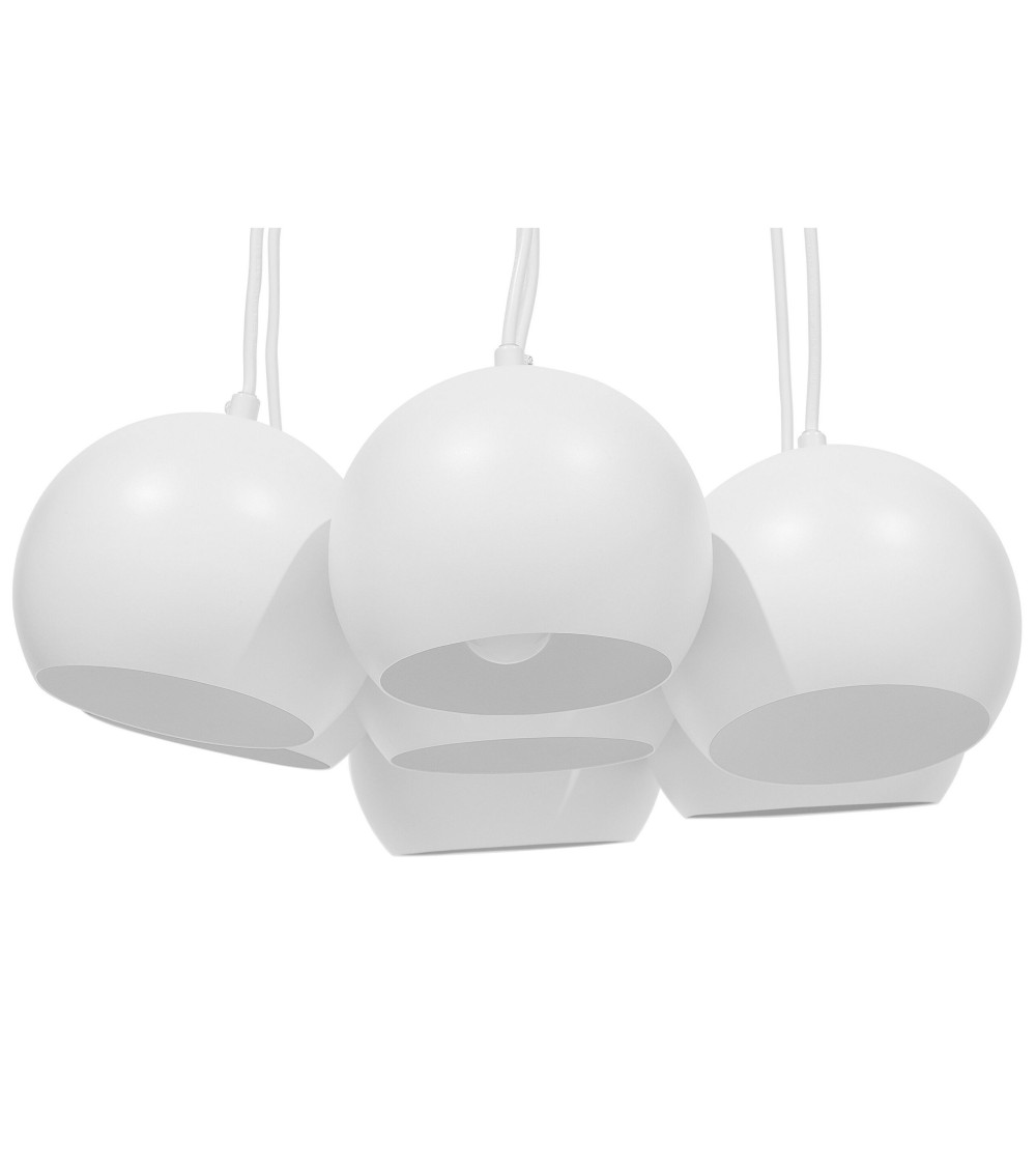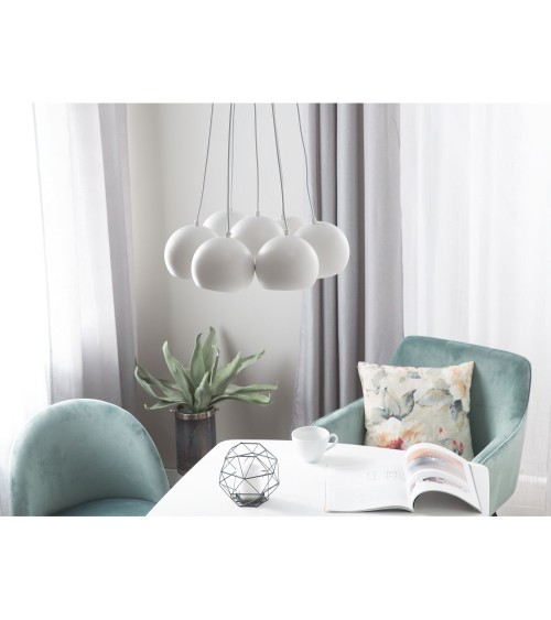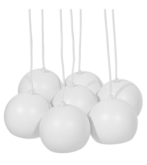 Les sept abat-jours sphériques en métal blanc mat diffusent non seulement une lumière vive, mais aussi un charme rétro. L'intérieur des abat-jours est également en blanc, de sorte que la lumière réfléchisse de façon optimale. Suspendus individuellement l'un à l'autre sur des câbles transparents, cela crée une source de lumière qui attirera l'attention de tous. Avec le grand nombre d'abat-jours, une atmosphère agréable se créer grâce à sa grande surface déclairage. La lampe est adaptée aux ampoules avec la douille E14 avec un maximum de 25W. Les ampoules ne sont pas incluses. La longueur du câble peut être raccourcie par un électricien qualifié.
