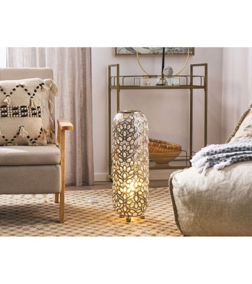 Cette magnifique lampe à poser donne à n'importe quelle pièce une touche glamour ! Fabriqué en métal brillant aux motifs orientaux dotés de petits cristaux, offrant une belle élégance. À travers les éléments scintillants brille un jeu de lumière et d'ombre, donnant une atmosphère confortable. La grande lampe à poser se fond dans différents styles et de design d'intérieur, qu'ils soient modernes, contemporain ou vintage. Adaptées aux ampoules E27 avec un maximum de 60W. Les ampoules ne sont pas incluses dans l'offre.