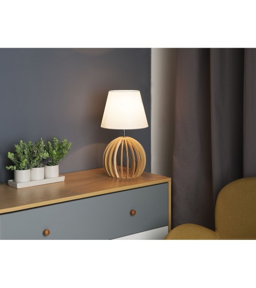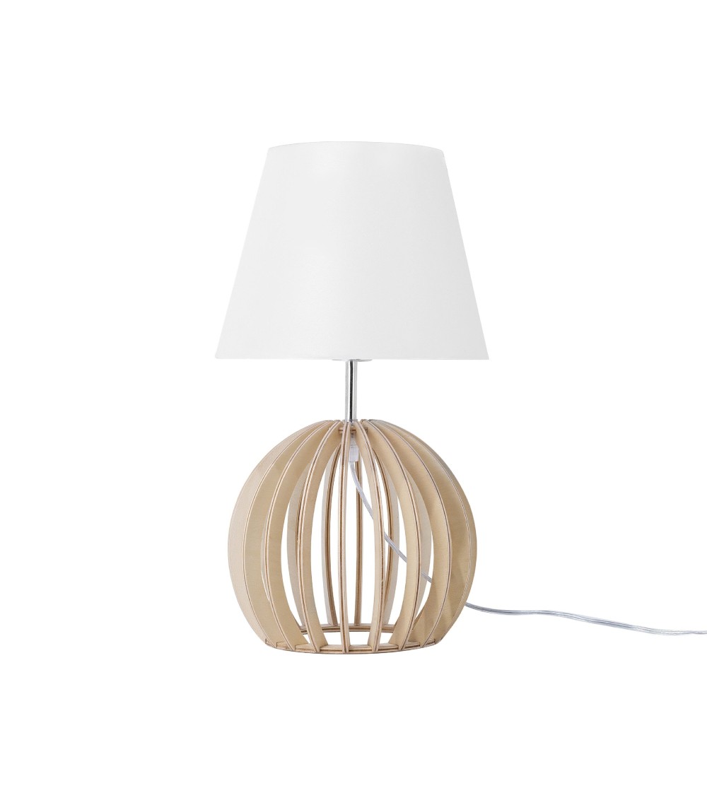 Une lampe qui illuminera votre quotidien ! L'abat-jour rond et classique en tissu polycoton blanc, donne une lumière agréable et chaleureuse. La base tendance et bombée impressionne par son design à partir d'étroites barres de bois de couleur naturelle et classique. Cette lampe dispose également d'un câble avec un interrupteur et convient aux ampoules E27 avec un maximum de 60W. L'ampoule n'est pas incluse dans l'offre.
