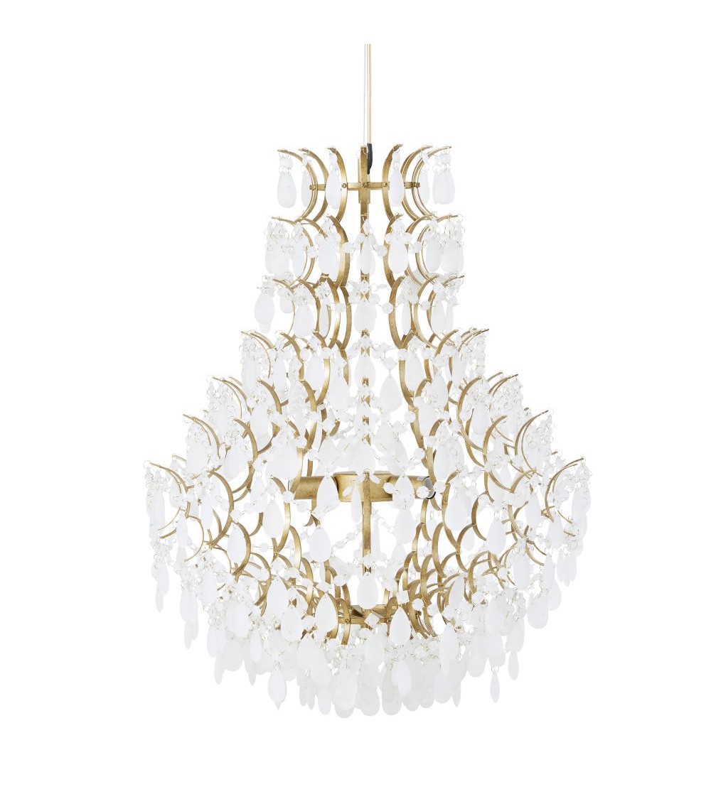 On parie que votre cur va s'emballer à la vue de la suspension à pampilles en verre opaline et métal doré BROADWAY. Vous ne résisterez pas longtemps au charme de ses pampilles en verre opaline, délicates et raffinées. Une fois allumée, cette suspension vous fascinera par son allure de nuage lumineux plein de poésie. Romantique à souhait, il offrira beaucoup d'élégance à un salon ou un séjour au style classique. Donnez-lui encore plus de douceur avec une banquette capitonnée en velours et une jolie console aux pieds galbés. Qu'en dites-vous ?
