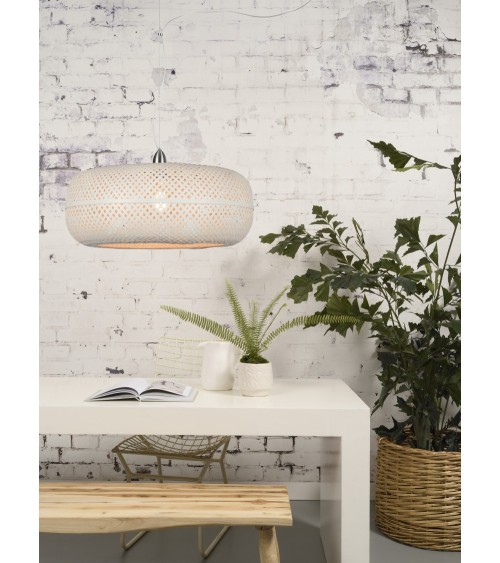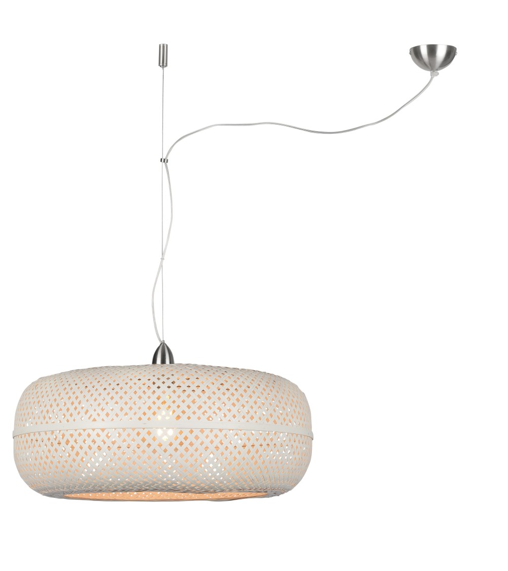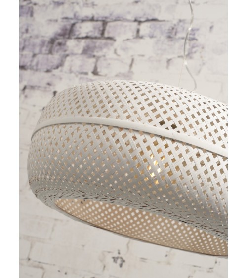 Nommée d'après la plus grande île de la province philippine du même nom, avec des falaises calcaires imposantes et des îlots de forêt luxuriante, la Suspension Palawan bambou ajoute un accent frais et moderne à votre salon, chambre, bureau ou étude. Le bambou organique de l'abat-jour blanc est soigneusement tissé à la main en un motif délicat qui joue subtilement avec la lumière et l'ombre pour créer une atmosphère qui invite à la relaxation. Avec un abat-jour de 60 cm x 25 cm de hauteur, Palawan fait une impression subtile mais attrayante d'exotisme, qui vous donnera envie d'explorer le lieu enchanteur dont il porte le nom, ou de le revisiter si vous y êtes déjà allé ! Le système de suspension flexible vous permet de placer la lampe exactement où vous le souhaitez, peu importe où se trouvent les prises murales.