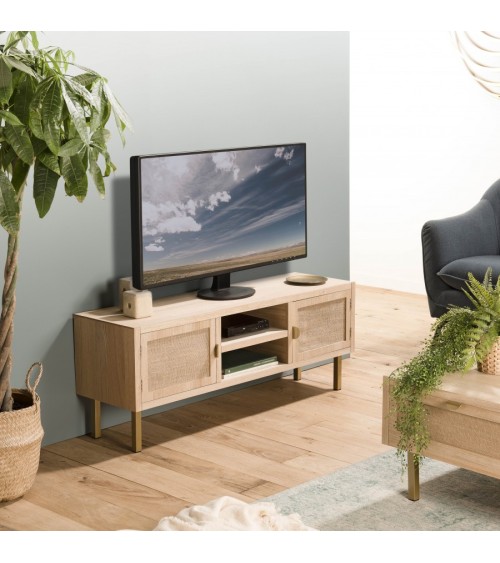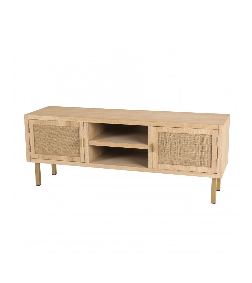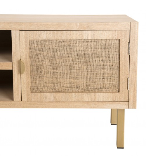 Meuble TV 2 niches 2 portes toile de jute pieds métal doré. Dimensions - 120 x 34 x 46,5 cm. Article en MDF plaqué frêne et Toile de jute. Découvrez cette collection sans plus attendre, son bois clair apaisant et son tissage naturel sont parfaits pour passer de bons moments dans un intérieur chaleureux. Ce joli meuble TV apportera de la luminosité à votre pièce. Composé de 2 niches et de 2 portes, vous pourrez aisément disposer et ranger vos objets. Le bois clair et la toile de jute s'accordent parfaitement et créer un ensemble harmonieux. Ses petites touches de métal doré lui donnent un côté original et unique.