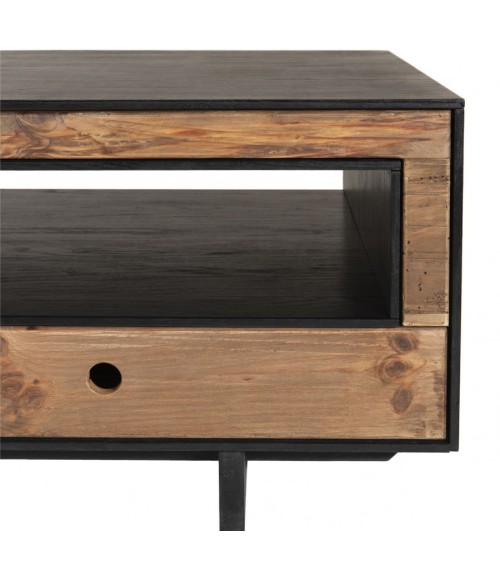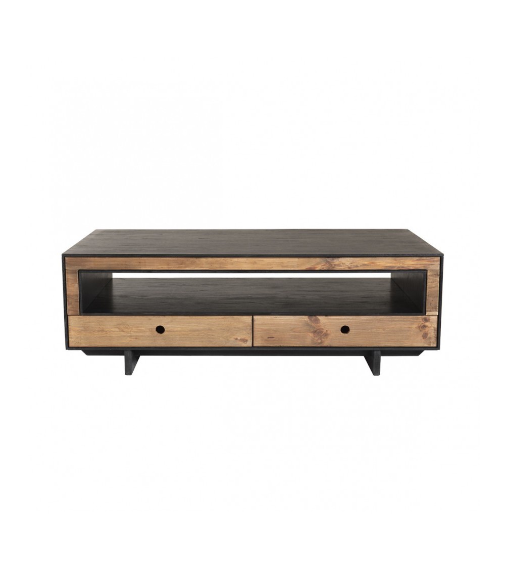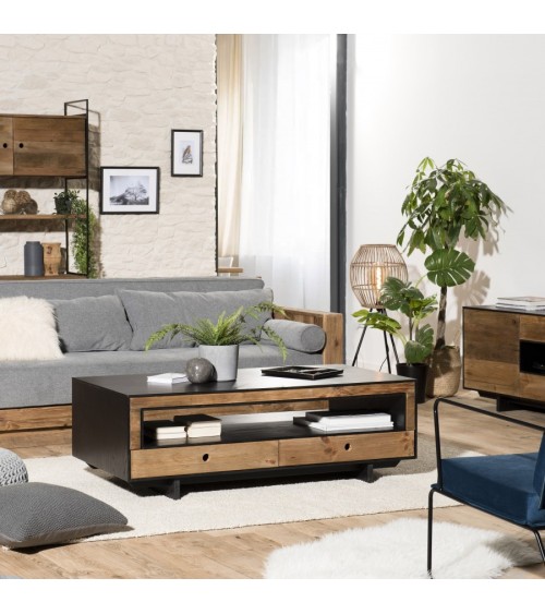 Table basse 4 tiroirs 1 niche en pin recyclé naturel et noir L135