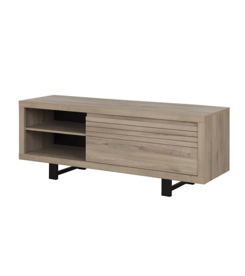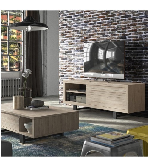Nous vous laissons découvrir ce meuble Tv style industriel couleur chêne. Fabriqué intégralement en France nous vous garantissons un meuble solide et durable.Votre meuble Tv style industriel couleur bois, fait une largeur de 160 cm pour vous permettre d'accueillir les dernières générations de grands téléviseurs , il fait également une hauteur de 60cm pour plus de confort visuel devant la TV.Caractéristiques produit -. Meuble en panneaux 100 pour cent origine France, et issus de forêts durables (label PEFC).. Deux niches ouvertes en panneaux 100 pour cent origine France, et issus de forêts durables (label PEFC).. 1 grand tiroir en panneaux de particules 100 pour cent origine France contrôlée, coulisses à galets grises. Pieds en hêtre massif laqué noir.Dimensions - 48 x 160 x 60 cmPoids - 42.6 kgDétails livraison - Meuble à monter soi même. Livraison sur RDV sur le pas de la porte (pas de livraison à l'étage). Garantie 2 ans