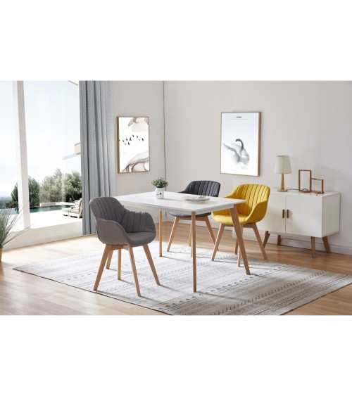 Le confort d'un fauteuil, l'utilité d'une chaise Bien stable sur ses 4 pieds en bois massif de hêtre surmontés d'une confortable assise rembourrée de mousse polyuréthane cette chaise est taillée pour le confort L'assise est d'une forme particulièrement agréable et qui assure un bon maintien Le style scandinave moderne est présent avec l'association du tissu en polyester curry et du bois naturel Déclinée en plusieurs coloris et finitions vous pourrez l'associer facilement à un large choix de table et dans tout type d'intérieur Garantie légale de conformité de 2 ans elle est livrée en 3.5 jours chez vous Paiement en plusieurs fois possible Existe en lot de 2