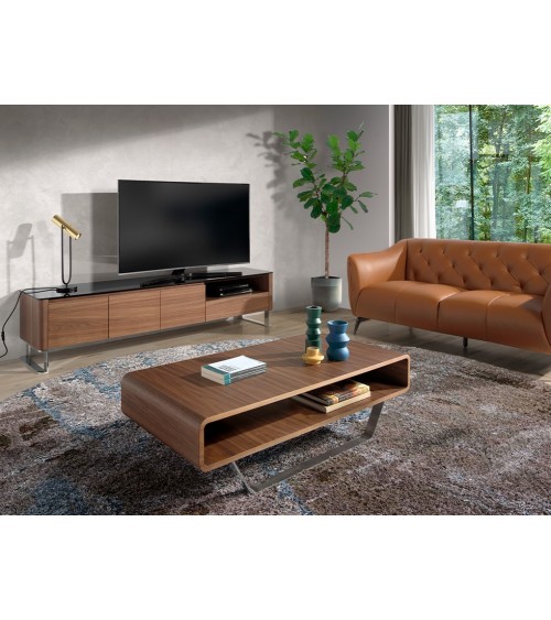 Produit à usages professionnels et particuliers. Meuble TV en verre noir et noyer modèle 3047 Angel Cerdá S.L.Meuble TV au design moderne en bois plaqué noyer naturel de 0,5 mm d'épaisseur, avec pieds en acier inoxydable chromé de 22 microns et élégant couvercle supérieur en verre trempé teinté noir avec lequel vous obtiendrez ce look sophistiqué que vous recherchez pour votre salle. Gardez tout à sa place grâce à son grand espace de rangement ouvert, son tiroir et ses portes avec système de fermeture amortie.STYLE- Cet élégant meuble TV en noyer ajoutera la touche sophistiquée, moderne et minimaliste que vous recherchez dans votre salon.MULTI USAGE- Polyvalent et fonctionnel, son design lui permet de s'intégrer dans n'importe quel espace, et est parfait pour se combiner avec les dernières tendances de la décoration.DÉCORATION ET CONFORT- Avec des lignes droites et simples, ce meuble TV avec un élégant plateau en verre trempé teinté noir sera idéal pour apporter cette touche de style et de sophistication que vous recherchez, sans négliger la fonctionnalité et l'aspect pratique.FONCTIONNALITÉ- En raison des dimensions de sa structure, ainsi que de son espace de rangement ouvert avec un tiroir et trois portes avec un système de fermeture en douceur, ce meuble TV définira les tendances et la personnalité, offrant également espace et chaleur à l'espace.GAMME PROFESSIONNELLE - A destination des architectes d'interieur, Bureaux, Commerces et événementiel, Hôtellerie, Restauration.