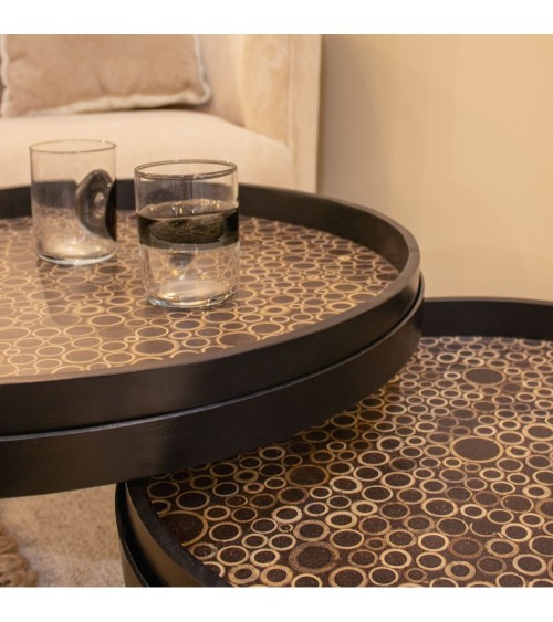 Sublimez votre décoration intérieure avec ce guéridon avec un plateau rond amovible en bois de marqueterie en noix de coco véritable et son pied en métal noir. Chic et moderne, ils peuvent être rapprochées ou éloignées selon l'utilisation désirée. Merveilleux travail artisanal ! Guéridon avec plateaux amovibles en bois de marqueterie en noix de coco Pieds en métal noir Guéridon Ø50cm H30cm et Ø60cm H35cm Poids - 10.600 kgs le set de deux tables Nettoyer à l'aide d'un chiffon sec