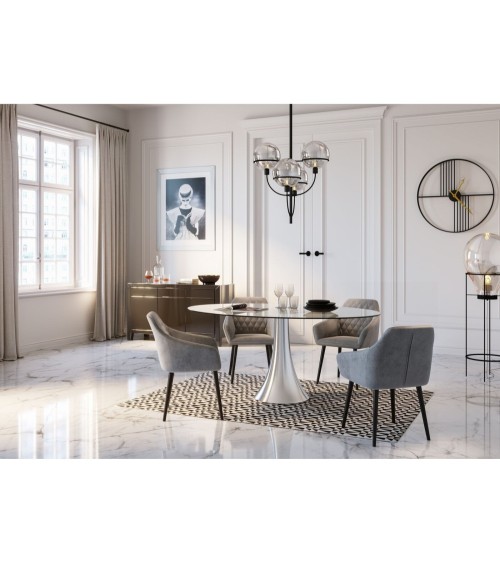 Avec son assise grise matelassée au toucher velours, cette chaise trouve sa place dans un intérieur élégant et sobre. Complétée par des pieds en acier poudré, elle se marie avec des tables en verre ou en marbre pour plus de chic. Capacité de charge maximale - 150 kg. Livrée avec les pieds à monter. Hauteur d'assise - 47 cm. Entretien - Enlevez les miettes et la poussière avec une brosse douce. Vérifiez que votre produit de nettoyage ne décolore pas la matière en l'essayant d'abord sur une zone non visible (par exemple sous l'assise).