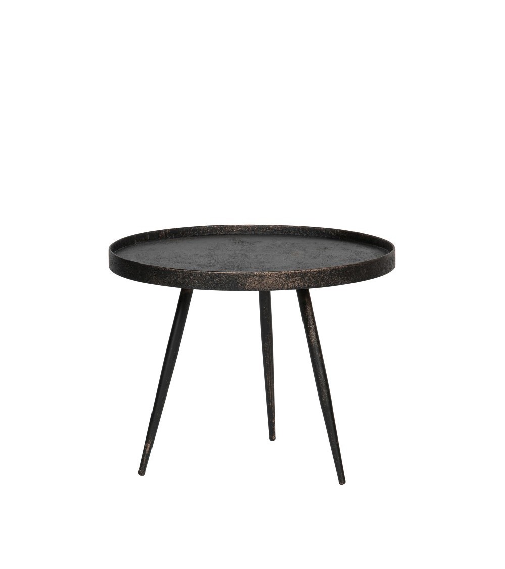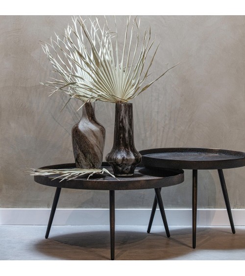 La table basse Bounds, d'un design résolument vintage, se révèle pratique. En plus de détenir des rebords, le plateau de cette table basse est rond de ø58cm. Elle est donc facile à intégrer ! Peu importe le style de votre pièce, elle apportera du charme ! Et détrompez.vous, le plateau de cette table basse est bien fait de contreplaqué ! C'est sa couleur sombre faite de phosphate de zinc qui lui donne cet effet métal légèrement usé... Hissée sur ses 4 pieds en métal, on la voit bien seule en bout de canapé. Accompagnée, on l'imagine plutôt sur un large tapis de couleur claire Sa petite sur est d'un diamètre de ø76cm, elle est donc plus large mais moins haute. En solo ou en duo, Bounds a réellement du caractère !