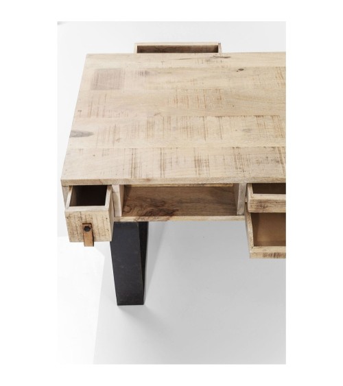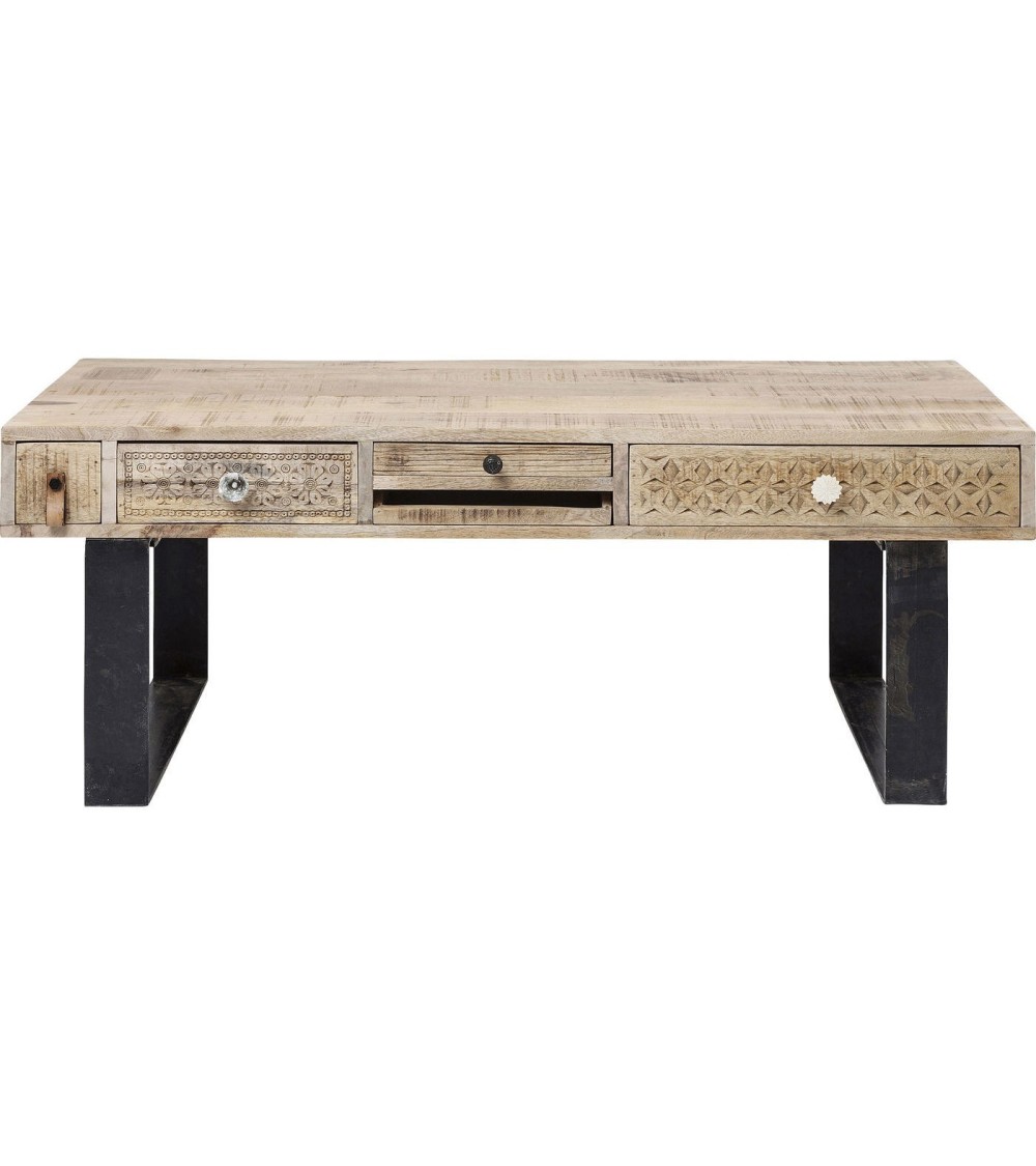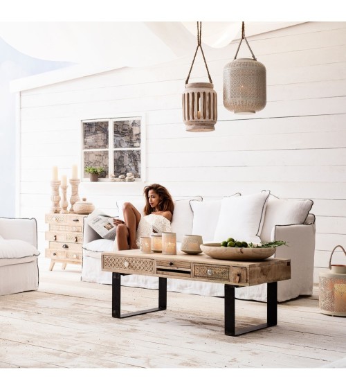 Cette table basse au look chaleureux et unique est l'épicentre de votre salon. Son bois de manguier laqué fait de cette table un élément essentiel au sein d'une décoration élégante et simple. Ses tiroirs et ses motifs lui apportent une touche d'originalité tout en restant sobres. Cette table vous rappellera la chaleur des bons jours ensoleillés et l'excitation des vacances. Ses quatre tiroirs vous permettront de ranger vos magazines et vos télécommandes. Dimensions de chaque tiroir (de droite à gauche) - 10x10x57 cm, 10x26x57 cm, 4x25x57 cm, 10x46x57 cm. Livrée démontée. Chaque pièce est unique. Entretien - Dépoussiérez régulièrement le meuble avec un chiffon propre, doux et non pelucheux. Pensez à changer régulièrement de chiffon car des tissus sales peuvent rayer la surface du meuble. Utilisez une éponge légèrement humidifiée pour nettoyer les miettes. Vous pouvez en complément utiliser un vernis transparent pour meuble lorsque le bois commence à perdre son éclat. N'oubliez pas de protéger vos surfaces des dessous de coupes, bougeoirs ou tout objet de décoration qui pourrait provoquer des auréoles et des rayures permanentes sur la surface vernie. Si vous renversez du liquide, par exemple de l'eau, sur votre meuble, essuyez de suite pour que le bois ne s'imbibe pas.