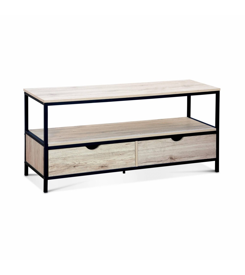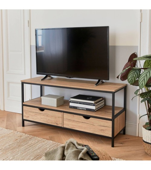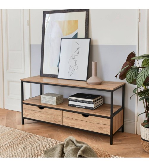 Meuble TV en décor bois et métal . Loft Les + produit Structure en métalDotée d'une étagère et de 2 tiroirs Facile d'entretienAprès plus de 10 ans d'expérience dans l'équipement extérieur, c'est tout naturellement (avec laide de nos clients inspirés et collaborateurs motivés) que la gamme Alice's Home spécialisée dans le mobilier et léquipement d'intérieur voit le jour, en gardant toujours les mêmes promesses.La collection Loft s'inscrit dans un style résolument industriel. Les meubles de cette gamme conjuguent l'authenticité du décor bois et l'esprit moderne du métal. Table et banc encastrable, étagère, bibliothèque, console... Les meubles Loft sauront trouver leur place dans votre maison grâce à leur design simple et leurs matières intemporelles. Un meuble TV à l'esprit loft Ce meuble TV viendra apporter un charme industriel à votre pièce de vie. Il associe harmonieusement le métal et le décor bois, clin d'oeil aux anciennes usines. Ses lignes droites et épurées en font un meuble élégant aux allures intemporelles qui deviendra vite la nouvelle pièce maîtresse de votre salon. Fonctionnel et pratique Non seulement élégant, ce meuble est aussi fonctionnel. Son plateau permet d'accueillir une télévision ainsi que d'autres objets de décoration. L'étagère et les deux tiroirs sont parfaits pour ranger votre décodeur
