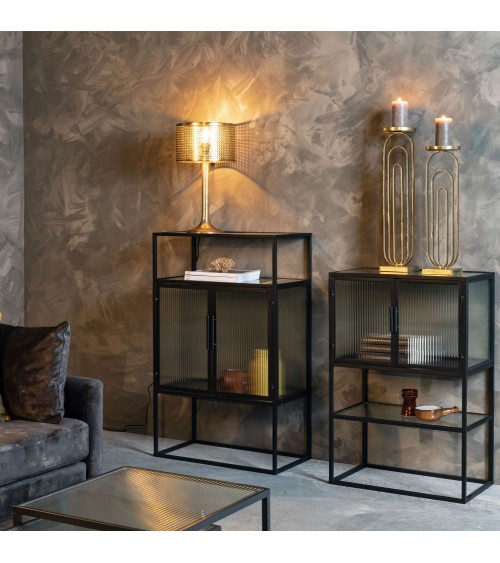 Un double avantage avec la vitrine design Boli. Elle permet d'optimiser le rangement et de rehausser la déco en même temps. D'un style retro.chic et contemporain à la fois, elle ne manque pas d'originalité. Elle est constituée d'un rangement avec 2 portes à fermeture magnétique et de deux étagères fixes. Le compartiment supérieur est entièrement vitré. Le verre trempé, avec ses lignes verticales, lui donne un effet raffiné tout en donnant à vos objets un peu de discrétion. L'étagère du bas est idéale pour déposer d'autres objets décoratifs, des livres ou autre. La structure en métal noir confère à cette vitrine un aspect compact et robuste. On la positionne dans l'entrée ou dans un coin du salon et on apprécie le résultat.