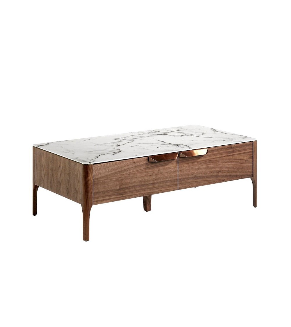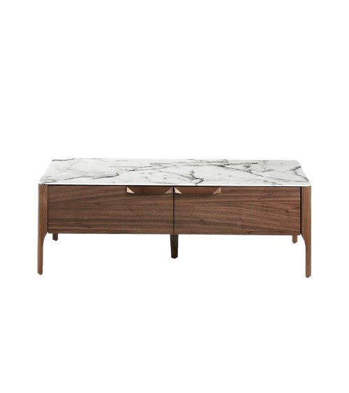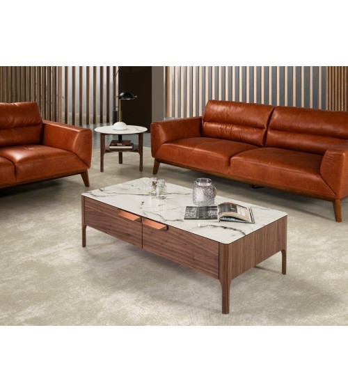 Ángel Cerdá est un groupe de tradition familiale avec plus de 125 ans dhistoire, sur 4 générations, dans le secteur du meuble. Table basse en fibre de verre effet marbre modèle 2046 Angel Cerdá S.L. Table basse de style moderne avec plateau en fibre de verre effet marbre calacatta de 4 mm et base en bois plaqué noyer naturel d'épaisseur 0,5 mm avec deux tiroirs avec système de fermeture en douceur. La touche originale est apportée par ses deux poignées en acier couleur cuivre. Chaque détail est pensé pour vous offrir le plus grand confort, ainsi qu'une pièce élégante et sophistiquée pour votre salon. STYLE - Cette table basse rectangulaire en fibre de verre effet marbre calacatta apportera une touche moderne à tout type de salon. Avec sa structure originale en noyer et ses poignées en acier couleur cuivre, vous créerez une ambiance chaleureuse, cosy et stylée. MULTIESTANCE - Grâce à son design polyvalent, vous pouvez l'associer aux dernières tendances en matière de décoration. QUALITÉ - Toutes nos tables basses sont fabriquées avec des matériaux de la plus haute qualité, garantissant un mobilier durable et fonctionnel. DÉCORATION ET CONFORT - La fibre de verre semblable au marbre calacatta et le bois couleur noyer offrent cet air moderne et actuel, bien sûr, sans négliger le plus grand confort. DIMENSIONS - De par ses dimensions, cette table basse au design moderne sera la pièce idéale pour habiller votre salon, étant également un élément très pratique pour votre intérieur.